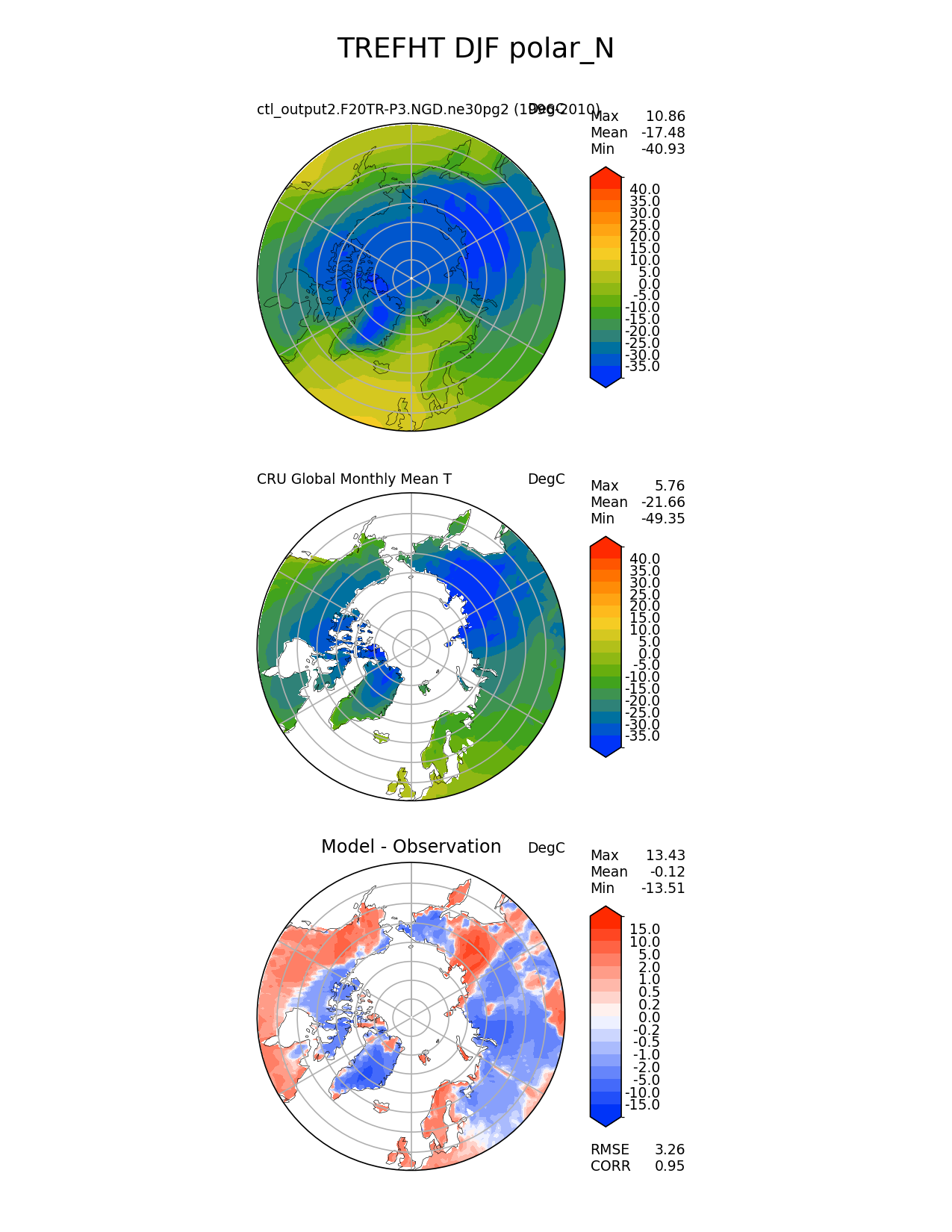 Use this command to recreate this image: | e3sm_diags polar --no_viewer --reference_data_path '/global/cfs/cdirs/e3sm/diagnostics/observations/Atm/climatology/' --test_data_path '/pscratch/sd/x/xsongsio/E3SM_simulation/ctl_output2.F20TR-P3.NGD.ne30pg2/diag/clim_rgr/' --results_dir '/global/cfs/cdirs/e3sm/www/xsongsio/ctl_output2.F20TR-P3.NGD.ne30pg2/15r' --case_id 'CRU_IPCC' --run_type 'model_vs_obs' --sets 'polar' --variables 'TREFHT' --seasons 'DJF' --regions 'polar_N' --regrid_tool 'esmf' --regrid_method 'conservative' --multiprocessing --num_workers '32' --main_title 'TREFHT DJF polar_N' --backend 'mpl' --output_format 'png' --canvas_size_w '1212' --canvas_size_h '1628' --figsize '8.5' '11.0' --dpi '150' --arrows --contour_levels '-35' '-30' '-25' '-20' '-15' '-10' '-5' '0' '5' '10' '15' '20' '25' '30' '35' '40' --test_name 'ctl_output2.F20TR-P3.NGD.ne30pg2' --test_title ' ' --test_colormap 'cet_rainbow.rgb' --ref_name 'CRU' --reference_name 'CRU Global Monthly Mean T' --reference_colormap 'cet_rainbow.rgb' --diff_title 'Model - Observation' --diff_colormap 'diverging_bwr.rgb' --diff_levels '-15' '-10' '-5' '-2' '-1' '-0.5' '-0.2' '0' '0.2' '0.5' '1' '2' '5' '10' '15' --granulate 'variables' 'seasons' 'plevs' 'regions' --selectors 'sets' 'seasons' |