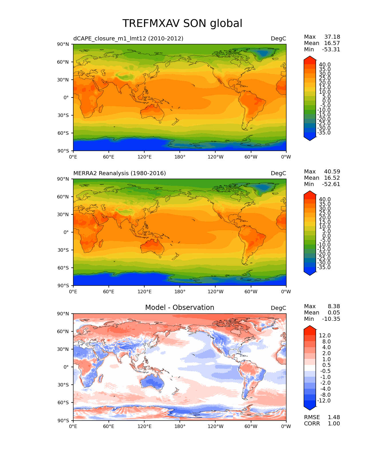 Use this command to recreate this image: | e3sm_diags lat_lon --no_viewer --reference_data_path '/global/cfs/cdirs/e3sm/acme_diags/obs_for_e3sm_diags/climatology/' --test_data_path '/pscratch/sd/x/xsongsio/E3SM_simulation/dCAPE_closure_m1_lmt12/diag/clim_rgr/3yr/' --results_dir '/global/cfs/cdirs/e3sm/www/xsongsio/dCAPE_closure_m1_lmt12/3yr' --case_id 'MERRA2' --run_type 'model_vs_obs' --sets 'lat_lon' --variables 'TREFMXAV' --seasons 'SON' --regions 'global' --regrid_tool 'esmf' --regrid_method 'conservative' --num_workers '32' --main_title 'TREFMXAV SON global' --backend 'mpl' --output_format 'png' --canvas_size_w '1212' --canvas_size_h '1628' --figsize '8.5' '11.0' --dpi '150' --arrows --contour_levels '-35' '-30' '-25' '-20' '-15' '-10' '-5' '0' '5' '10' '15' '20' '25' '30' '35' '40' --test_name 'dCAPE_closure_m1_lmt12' --test_title ' ' --test_colormap 'cet_rainbow.rgb' --ref_name 'MERRA2' --reference_name 'MERRA2 Reanalysis' --reference_colormap 'cet_rainbow.rgb' --diff_title 'Model - Observation' --diff_colormap 'diverging_bwr.rgb' --diff_levels '-12' '-8' '-4' '-2' '-1' '-0.5' '0.5' '1' '2' '4' '8' '12' --granulate 'variables' 'seasons' 'plevs' 'regions' --selectors 'sets' 'seasons' |