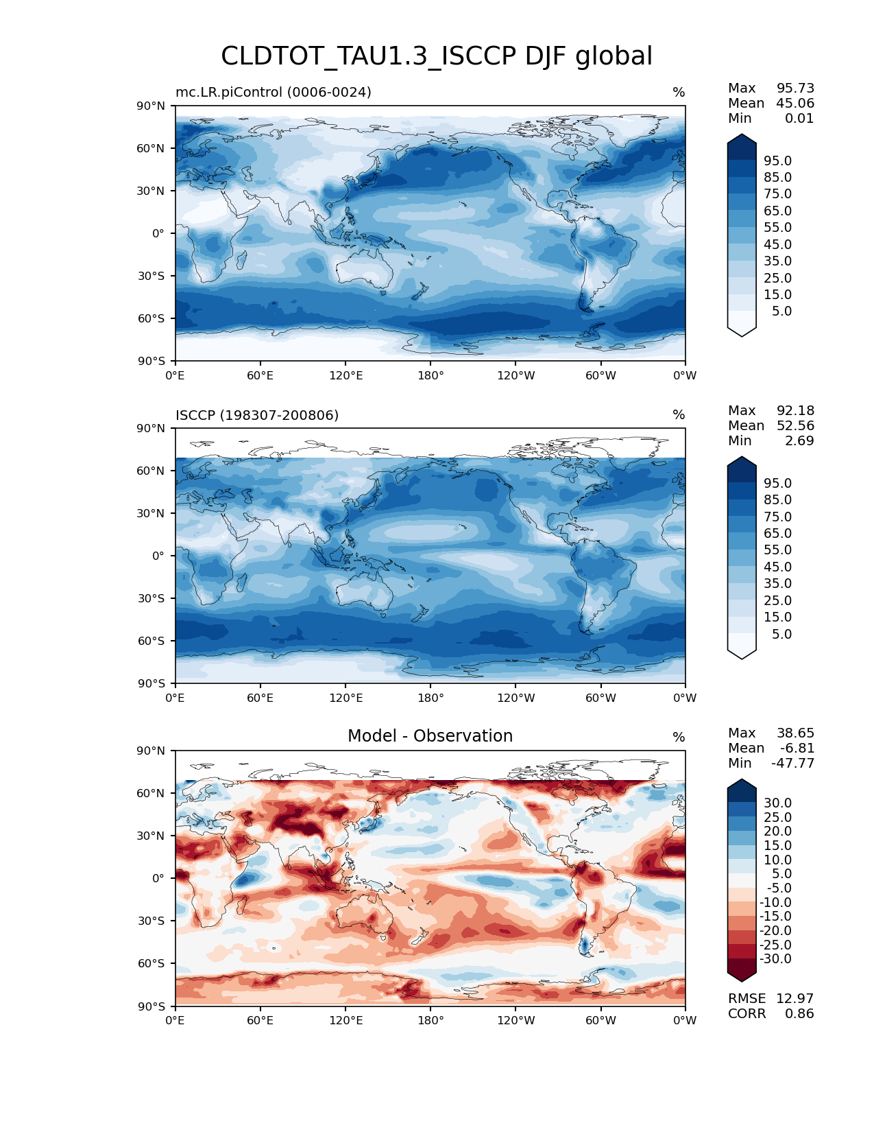Use this command to recreate this image: | e3sm_diags lat_lon --no_viewer --case_id 'Cloud ISCCP' --sets 'lat_lon' --run_type 'model_vs_obs' --variables 'CLDTOT_TAU1.3_ISCCP' --seasons 'DJF' --regions 'global' --regrid_tool 'esmf' --regrid_method 'conservative' --main_title 'CLDTOT_TAU1.3_ISCCP DJF global' --backend 'mpl' --output_format 'png' --canvas_size_w '1212' --canvas_size_h '1628' --figsize '8.5' '11.0' --dpi '150' --arrows --contour_levels '5' '15' '25' '35' '45' '55' '65' '75' '85' '95' --test_name 'mc.LR.piControl' --test_title ' ' --test_colormap 'Blues' --ref_name 'ISCCPCOSP' --reference_name 'ISCCP' --reference_colormap 'Blues' --diff_title 'Model - Observation' --diff_colormap 'RdBu' --diff_levels '-30' '-25' '-20' '-15' '-10' '-5' '5' '10' '15' '20' '25' '30' --num_workers '4' --granulate 'variables' 'seasons' 'plevs' 'regions' --selectors 'sets' 'seasons' --reference_data_path '/global/cfs/cdirs/e3sm/acme_diags/obs_for_e3sm_diags/climatology/' --test_data_path '/global/cscratch1/sd/xsongsio/E3SM_simulations/mc.LR.piControl/diag/clim_rgr/19yr/' --results_dir '/global/cfs/cdirs/e3sm/www/xsongsio/mc.LR.piControl/19yr' |