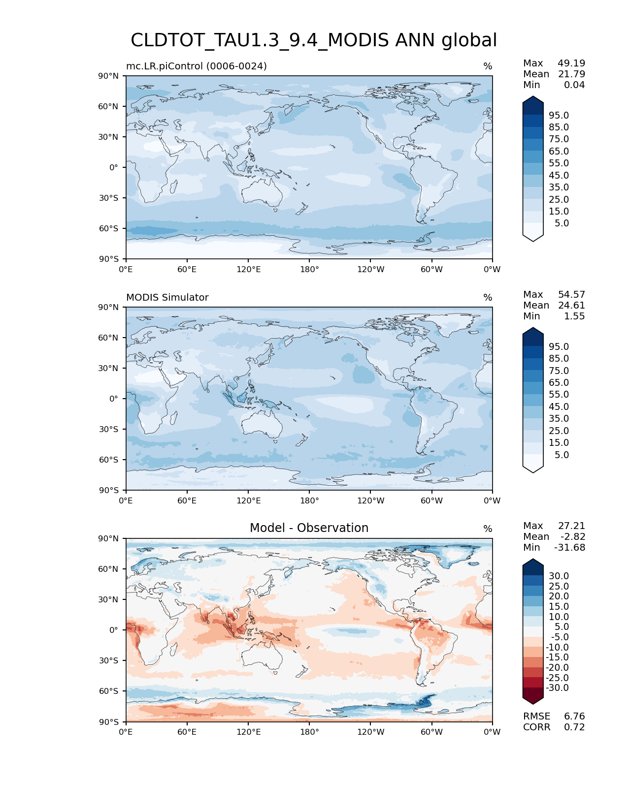 Use this command to recreate this image: | e3sm_diags lat_lon --no_viewer --case_id 'Cloud MODIS' --sets 'lat_lon' --run_type 'model_vs_obs' --variables 'CLDTOT_TAU1.3_9.4_MODIS' --seasons 'ANN' --regions 'global' --regrid_tool 'esmf' --regrid_method 'conservative' --main_title 'CLDTOT_TAU1.3_9.4_MODIS ANN global' --backend 'mpl' --output_format 'png' --canvas_size_w '1212' --canvas_size_h '1628' --figsize '8.5' '11.0' --dpi '150' --arrows --contour_levels '5' '15' '25' '35' '45' '55' '65' '75' '85' '95' --test_name 'mc.LR.piControl' --test_title ' ' --test_colormap 'Blues' --ref_name 'MODISCOSP' --reference_name 'MODIS Simulator' --reference_colormap 'Blues' --diff_title 'Model - Observation' --diff_colormap 'RdBu' --diff_levels '-30' '-25' '-20' '-15' '-10' '-5' '5' '10' '15' '20' '25' '30' --num_workers '4' --granulate 'variables' 'seasons' 'plevs' 'regions' --selectors 'sets' 'seasons' --reference_data_path '/global/cfs/cdirs/e3sm/acme_diags/obs_for_e3sm_diags/climatology/' --test_data_path '/global/cscratch1/sd/xsongsio/E3SM_simulations/mc.LR.piControl/diag/clim_rgr/19yr/' --results_dir '/global/cfs/cdirs/e3sm/www/xsongsio/mc.LR.piControl/19yr' |