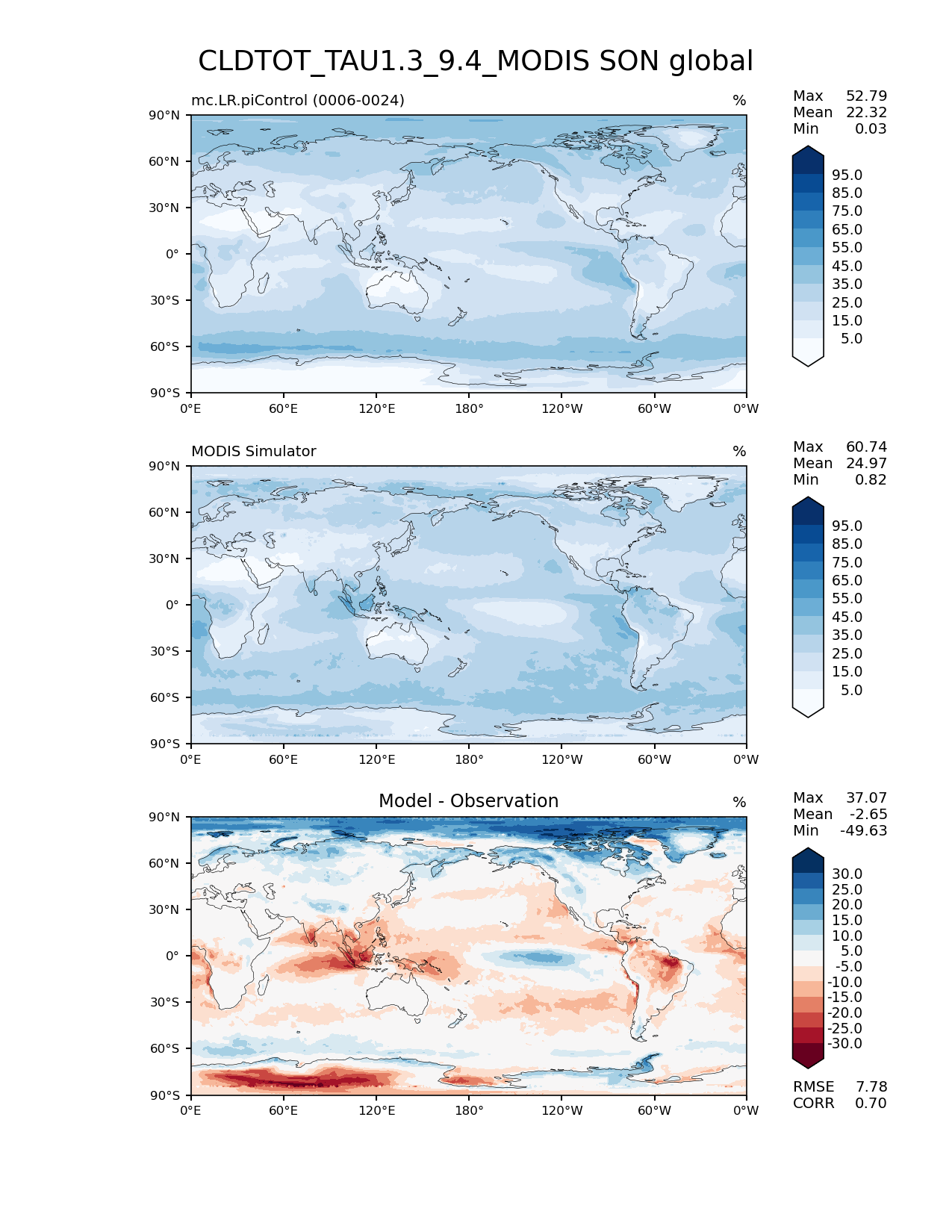 Use this command to recreate this image: | e3sm_diags lat_lon --no_viewer --case_id 'Cloud MODIS' --sets 'lat_lon' --run_type 'model_vs_obs' --variables 'CLDTOT_TAU1.3_9.4_MODIS' --seasons 'SON' --regions 'global' --regrid_tool 'esmf' --regrid_method 'conservative' --main_title 'CLDTOT_TAU1.3_9.4_MODIS SON global' --backend 'mpl' --output_format 'png' --canvas_size_w '1212' --canvas_size_h '1628' --figsize '8.5' '11.0' --dpi '150' --arrows --contour_levels '5' '15' '25' '35' '45' '55' '65' '75' '85' '95' --test_name 'mc.LR.piControl' --test_title ' ' --test_colormap 'Blues' --ref_name 'MODISCOSP' --reference_name 'MODIS Simulator' --reference_colormap 'Blues' --diff_title 'Model - Observation' --diff_colormap 'RdBu' --diff_levels '-30' '-25' '-20' '-15' '-10' '-5' '5' '10' '15' '20' '25' '30' --num_workers '4' --granulate 'variables' 'seasons' 'plevs' 'regions' --selectors 'sets' 'seasons' --reference_data_path '/global/cfs/cdirs/e3sm/acme_diags/obs_for_e3sm_diags/climatology/' --test_data_path '/global/cscratch1/sd/xsongsio/E3SM_simulations/mc.LR.piControl/diag/clim_rgr/19yr/' --results_dir '/global/cfs/cdirs/e3sm/www/xsongsio/mc.LR.piControl/19yr' |