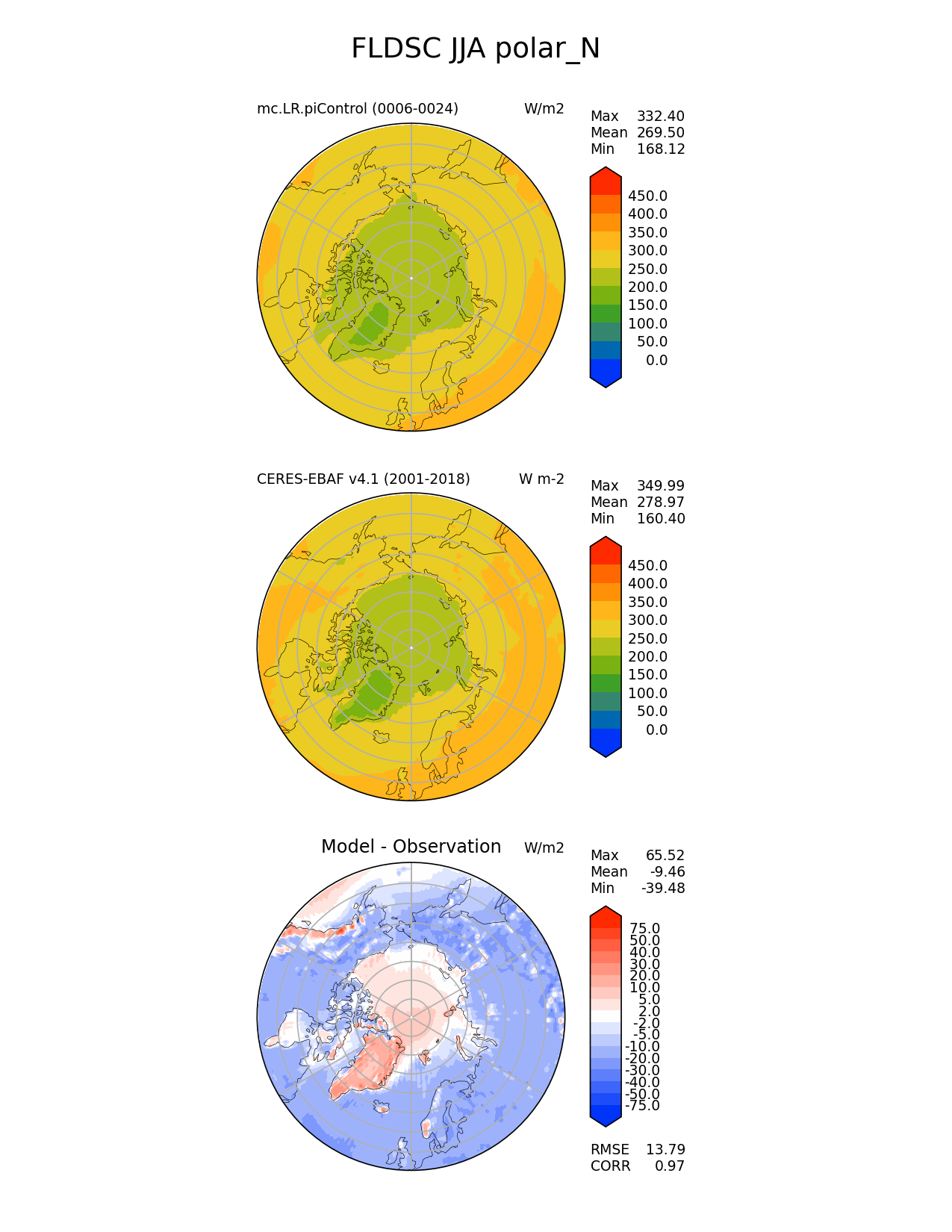 Use this command to recreate this image: | e3sm_diags polar --no_viewer --case_id 'CERES-EBAF-surface-v4.1' --sets 'polar' --run_type 'model_vs_obs' --variables 'FLDSC' --seasons 'JJA' --regions 'polar_N' --regrid_tool 'esmf' --regrid_method 'conservative' --main_title 'FLDSC JJA polar_N' --backend 'mpl' --output_format 'png' --canvas_size_w '1212' --canvas_size_h '1628' --figsize '8.5' '11.0' --dpi '150' --arrows --contour_levels '0' '50' '100' '150' '200' '250' '300' '350' '400' '450' --test_name 'mc.LR.piControl' --test_title ' ' --test_colormap 'cet_rainbow.rgb' --ref_name 'ceres_ebaf_surface_v4.1' --reference_name 'CERES-EBAF v4.1' --reference_colormap 'cet_rainbow.rgb' --diff_title 'Model - Observation' --diff_colormap 'diverging_bwr.rgb' --diff_levels '-75' '-50' '-40' '-30' '-20' '-10' '-5' '-2' '2' '5' '10' '20' '30' '40' '50' '75' --num_workers '4' --granulate 'variables' 'seasons' 'plevs' 'regions' --selectors 'sets' 'seasons' --reference_data_path '/global/cfs/cdirs/e3sm/acme_diags/obs_for_e3sm_diags/climatology/' --test_data_path '/global/cscratch1/sd/xsongsio/E3SM_simulations/mc.LR.piControl/diag/clim_rgr/19yr/' --results_dir '/global/cfs/cdirs/e3sm/www/xsongsio/mc.LR.piControl/19yr' |