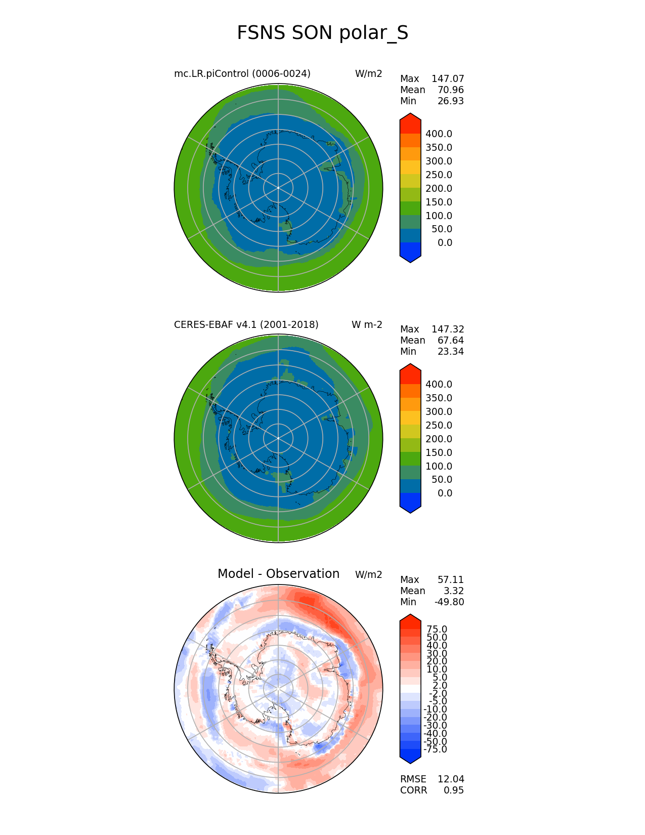 Use this command to recreate this image: | e3sm_diags polar --no_viewer --case_id 'CERES-EBAF-surface-v4.1' --sets 'polar' --run_type 'model_vs_obs' --variables 'FSNS' --seasons 'SON' --regions 'polar_S' --regrid_tool 'esmf' --regrid_method 'conservative' --main_title 'FSNS SON polar_S' --backend 'mpl' --output_format 'png' --canvas_size_w '1212' --canvas_size_h '1628' --figsize '8.5' '11.0' --dpi '150' --arrows --contour_levels '0' '50' '100' '150' '200' '250' '300' '350' '400' --test_name 'mc.LR.piControl' --test_title ' ' --test_colormap 'cet_rainbow.rgb' --ref_name 'ceres_ebaf_surface_v4.1' --reference_name 'CERES-EBAF v4.1' --reference_colormap 'cet_rainbow.rgb' --diff_title 'Model - Observation' --diff_colormap 'diverging_bwr.rgb' --diff_levels '-75' '-50' '-40' '-30' '-20' '-10' '-5' '-2' '2' '5' '10' '20' '30' '40' '50' '75' --num_workers '4' --granulate 'variables' 'seasons' 'plevs' 'regions' --selectors 'sets' 'seasons' --reference_data_path '/global/cfs/cdirs/e3sm/acme_diags/obs_for_e3sm_diags/climatology/' --test_data_path '/global/cscratch1/sd/xsongsio/E3SM_simulations/mc.LR.piControl/diag/clim_rgr/19yr/' --results_dir '/global/cfs/cdirs/e3sm/www/xsongsio/mc.LR.piControl/19yr' |