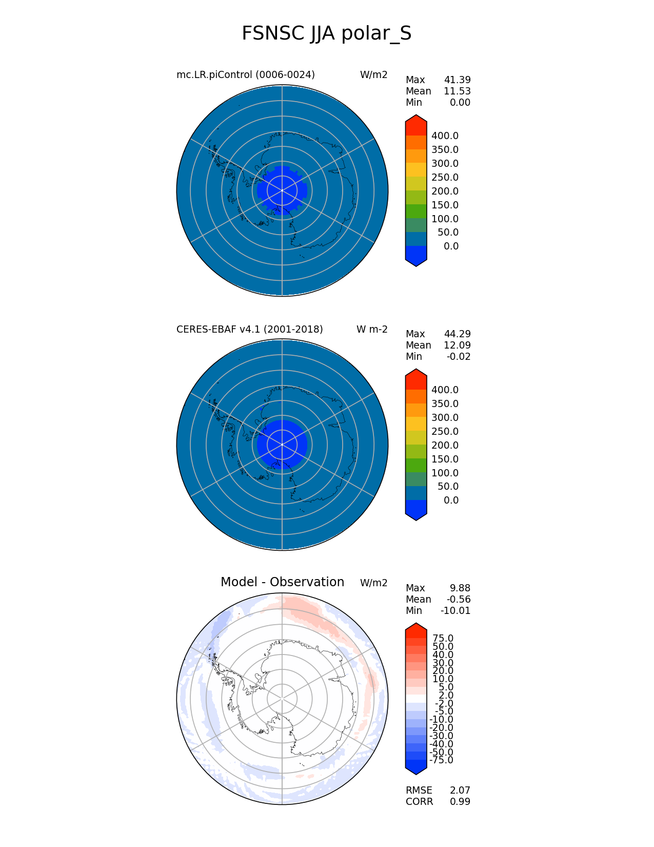 Use this command to recreate this image: | e3sm_diags polar --no_viewer --case_id 'CERES-EBAF-surface-v4.1' --sets 'polar' --run_type 'model_vs_obs' --variables 'FSNSC' --seasons 'JJA' --regions 'polar_S' --regrid_tool 'esmf' --regrid_method 'conservative' --main_title 'FSNSC JJA polar_S' --backend 'mpl' --output_format 'png' --canvas_size_w '1212' --canvas_size_h '1628' --figsize '8.5' '11.0' --dpi '150' --arrows --contour_levels '0' '50' '100' '150' '200' '250' '300' '350' '400' --test_name 'mc.LR.piControl' --test_title ' ' --test_colormap 'cet_rainbow.rgb' --ref_name 'ceres_ebaf_surface_v4.1' --reference_name 'CERES-EBAF v4.1' --reference_colormap 'cet_rainbow.rgb' --diff_title 'Model - Observation' --diff_colormap 'diverging_bwr.rgb' --diff_levels '-75' '-50' '-40' '-30' '-20' '-10' '-5' '-2' '2' '5' '10' '20' '30' '40' '50' '75' --num_workers '4' --granulate 'variables' 'seasons' 'plevs' 'regions' --selectors 'sets' 'seasons' --reference_data_path '/global/cfs/cdirs/e3sm/acme_diags/obs_for_e3sm_diags/climatology/' --test_data_path '/global/cscratch1/sd/xsongsio/E3SM_simulations/mc.LR.piControl/diag/clim_rgr/19yr/' --results_dir '/global/cfs/cdirs/e3sm/www/xsongsio/mc.LR.piControl/19yr' |