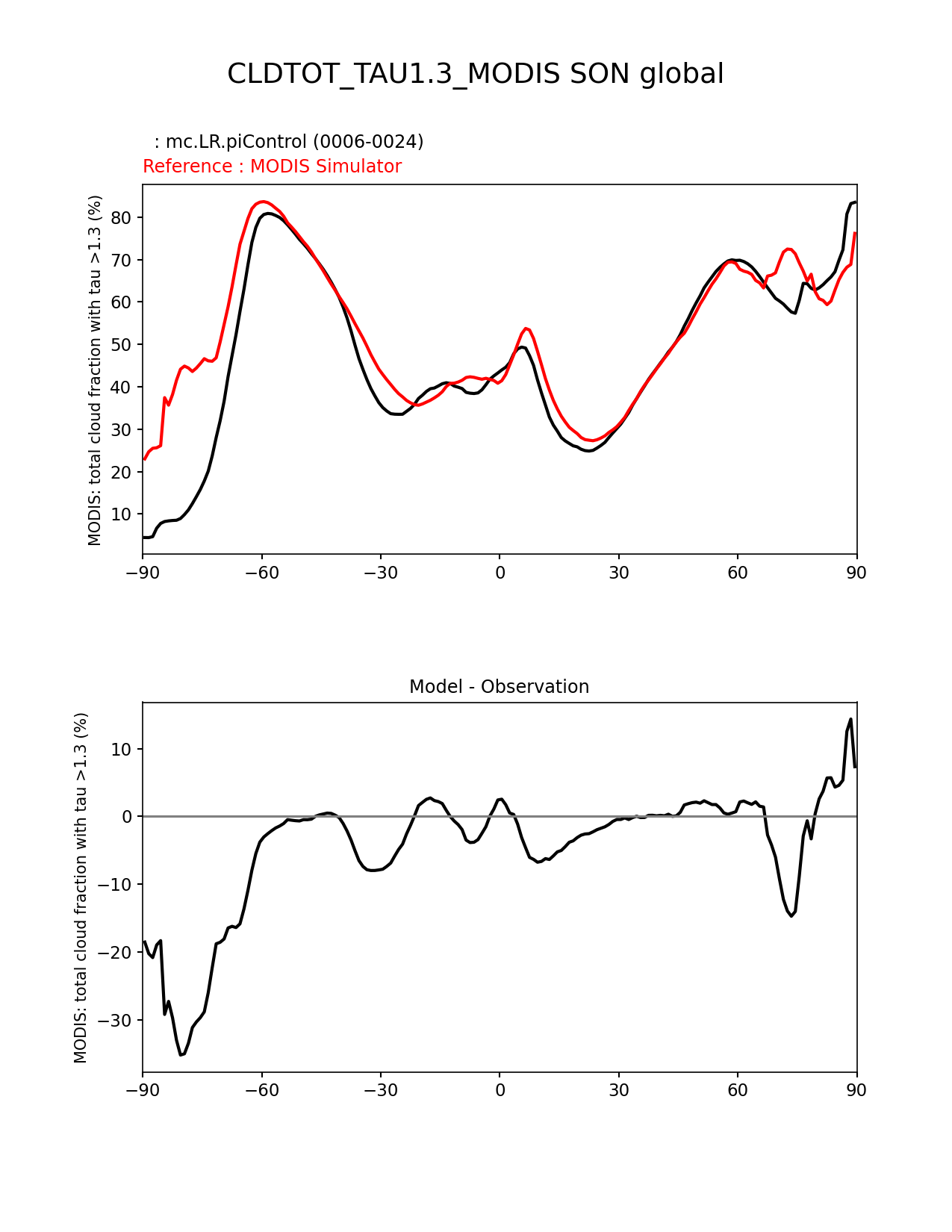Use this command to recreate this image: | e3sm_diags zonal_mean_xy --no_viewer --case_id 'Cloud MODIS' --sets 'zonal_mean_xy' --run_type 'model_vs_obs' --variables 'CLDTOT_TAU1.3_MODIS' --seasons 'SON' --regions 'global' --regrid_tool 'esmf' --regrid_method 'conservative' --main_title 'CLDTOT_TAU1.3_MODIS SON global' --backend 'mpl' --output_format 'png' --canvas_size_w '1212' --canvas_size_h '1628' --figsize '8.5' '11.0' --dpi '150' --arrows --test_name 'mc.LR.piControl' --test_title ' ' --test_colormap 'cet_rainbow.rgb' --ref_name 'MODISCOSP' --reference_name 'MODIS Simulator' --reference_colormap 'cet_rainbow.rgb' --diff_title 'Model - Observation' --diff_colormap 'diverging_bwr.rgb' --num_workers '4' --granulate 'variables' 'seasons' 'plevs' 'regions' --selectors 'sets' 'seasons' --reference_data_path '/global/cfs/cdirs/e3sm/acme_diags/obs_for_e3sm_diags/climatology/' --test_data_path '/global/cscratch1/sd/xsongsio/E3SM_simulations/mc.LR.piControl/diag/clim_rgr/19yr/' --results_dir '/global/cfs/cdirs/e3sm/www/xsongsio/mc.LR.piControl/19yr' |