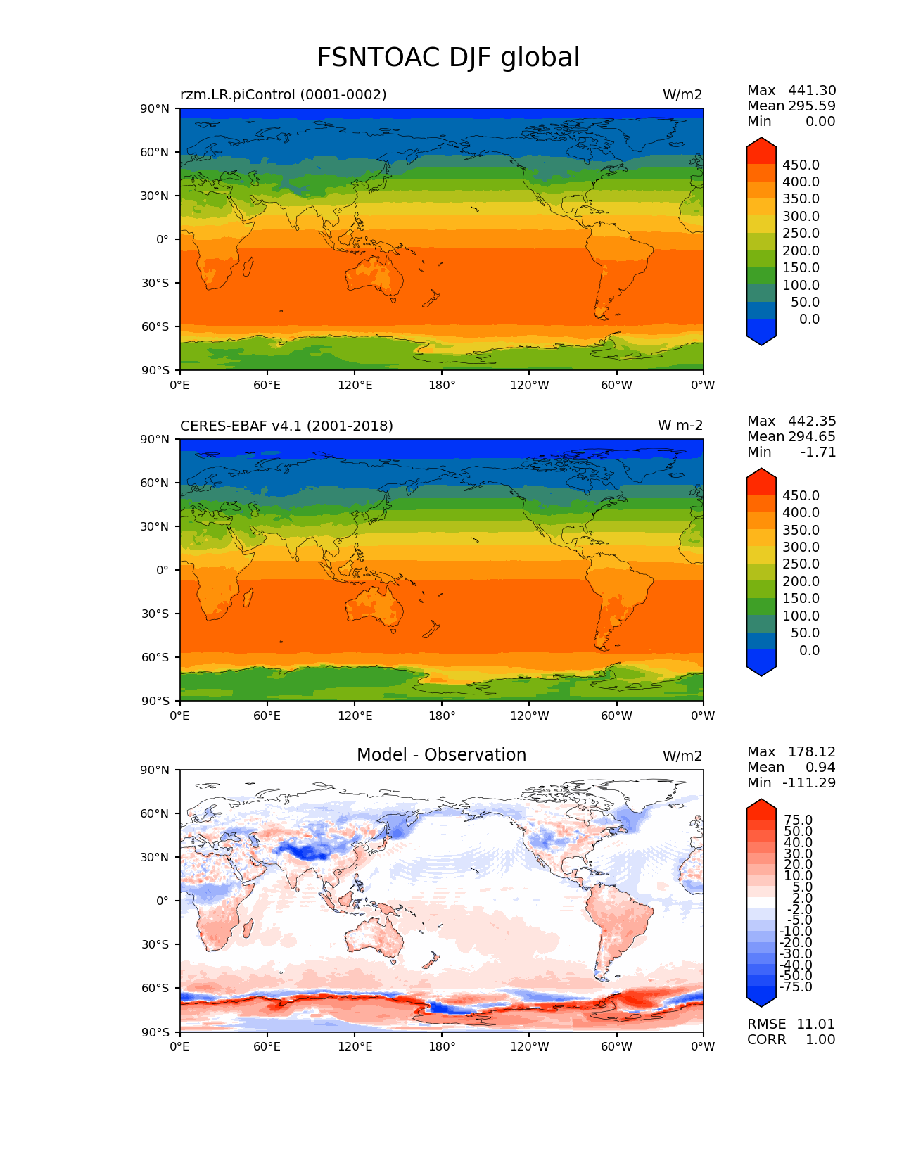 Use this command to recreate this image: | e3sm_diags lat_lon --no_viewer --case_id 'CERES-EBAF-TOA-v4.1' --sets 'lat_lon' --run_type 'model_vs_obs' --variables 'FSNTOAC' --seasons 'DJF' --regions 'global' --regrid_tool 'esmf' --regrid_method 'conservative' --main_title 'FSNTOAC DJF global' --backend 'mpl' --output_format 'png' --canvas_size_w '1212' --canvas_size_h '1628' --figsize '8.5' '11.0' --dpi '150' --arrows --contour_levels '0' '50' '100' '150' '200' '250' '300' '350' '400' '450' --test_name 'rzm.LR.piControl' --test_title ' ' --test_colormap 'cet_rainbow.rgb' --ref_name 'ceres_ebaf_toa_v4.1' --reference_name 'CERES-EBAF v4.1' --reference_colormap 'cet_rainbow.rgb' --diff_title 'Model - Observation' --diff_colormap 'diverging_bwr.rgb' --diff_levels '-75' '-50' '-40' '-30' '-20' '-10' '-5' '-2' '2' '5' '10' '20' '30' '40' '50' '75' --num_workers '4' --granulate 'variables' 'seasons' 'plevs' 'regions' --selectors 'sets' 'seasons' --reference_data_path '/global/cfs/cdirs/e3sm/acme_diags/obs_for_e3sm_diags/climatology/' --test_data_path '/global/cscratch1/sd/xsongsio/E3SM_simulations/rzm.LR.piControl/diag/clim_rgr/2yr/' --results_dir '/global/cfs/cdirs/e3sm/www/xsongsio/rzm.LR.piControl/2yr' |