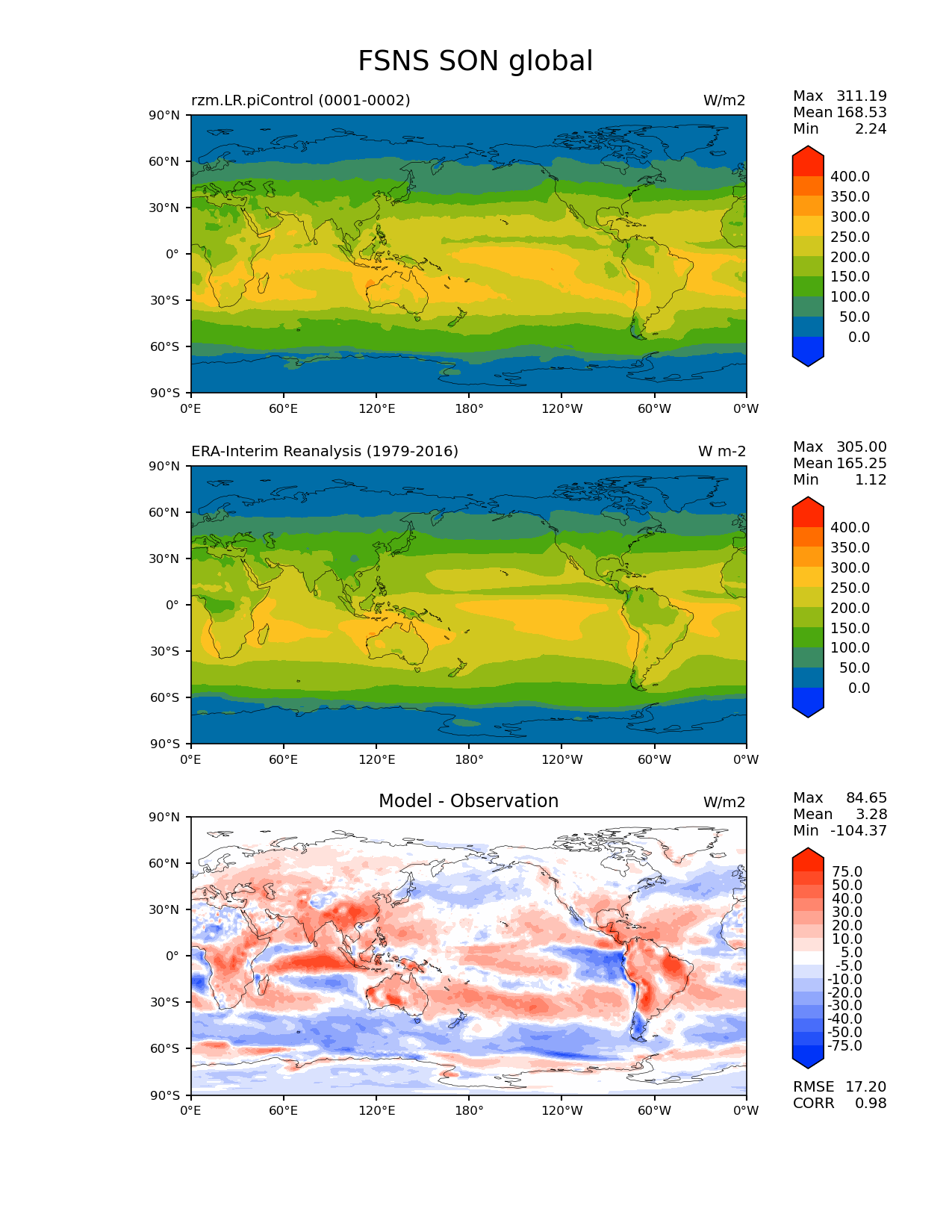 Use this command to recreate this image: | e3sm_diags lat_lon --no_viewer --case_id 'ERA-Interim' --sets 'lat_lon' --run_type 'model_vs_obs' --variables 'FSNS' --seasons 'SON' --regions 'global' --regrid_tool 'esmf' --regrid_method 'conservative' --main_title 'FSNS SON global' --backend 'mpl' --output_format 'png' --canvas_size_w '1212' --canvas_size_h '1628' --figsize '8.5' '11.0' --dpi '150' --arrows --contour_levels '0' '50' '100' '150' '200' '250' '300' '350' '400' --test_name 'rzm.LR.piControl' --test_title ' ' --test_colormap 'cet_rainbow.rgb' --ref_name 'ERA-Interim' --reference_name 'ERA-Interim Reanalysis' --reference_colormap 'cet_rainbow.rgb' --diff_title 'Model - Observation' --diff_colormap 'diverging_bwr.rgb' --diff_levels '-75' '-50' '-40' '-30' '-20' '-10' '-5' '5' '10' '20' '30' '40' '50' '75' --num_workers '4' --granulate 'variables' 'seasons' 'plevs' 'regions' --selectors 'sets' 'seasons' --reference_data_path '/global/cfs/cdirs/e3sm/acme_diags/obs_for_e3sm_diags/climatology/' --test_data_path '/global/cscratch1/sd/xsongsio/E3SM_simulations/rzm.LR.piControl/diag/clim_rgr/2yr/' --results_dir '/global/cfs/cdirs/e3sm/www/xsongsio/rzm.LR.piControl/2yr' |
