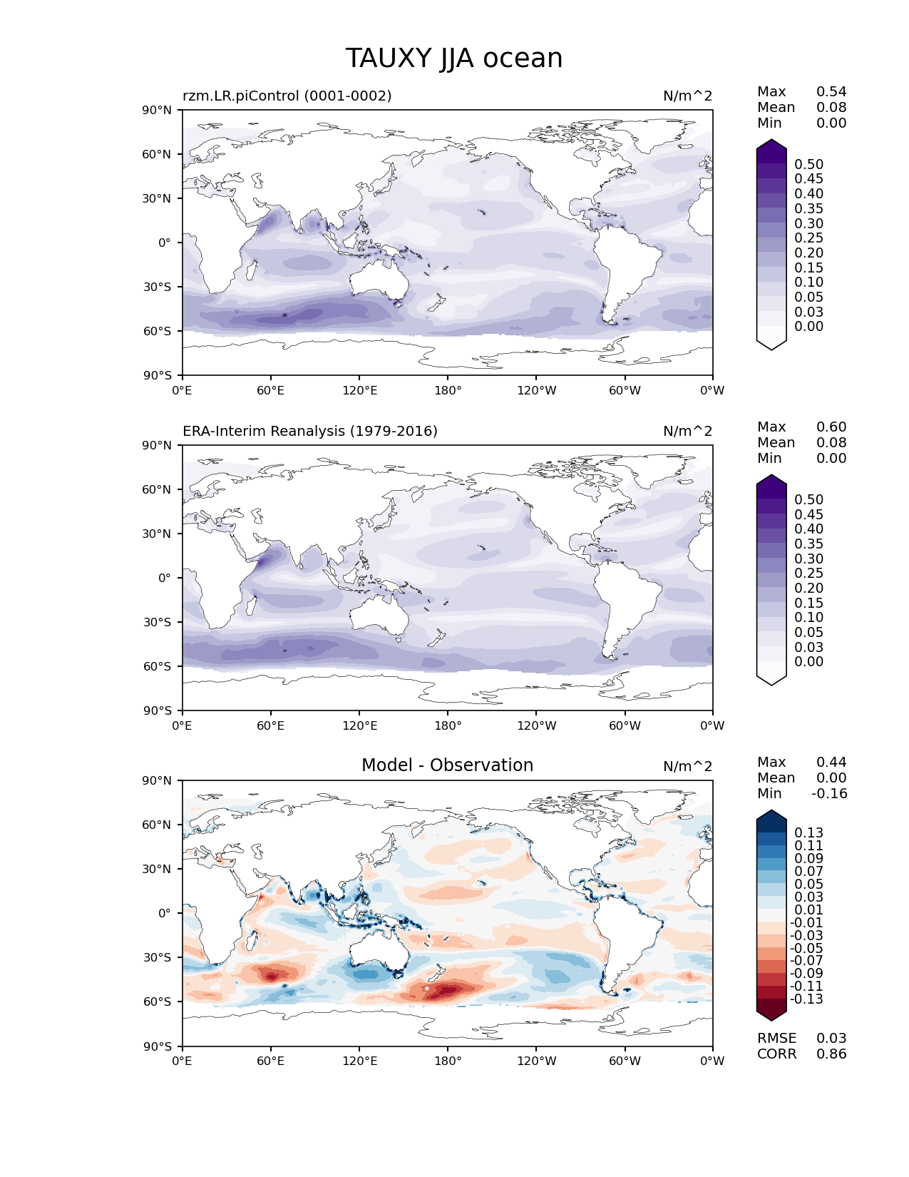 Use this command to recreate this image: | e3sm_diags lat_lon --no_viewer --case_id 'ERA-Interim' --sets 'lat_lon' --run_type 'model_vs_obs' --variables 'TAUXY' --seasons 'JJA' --regions 'ocean' --regrid_tool 'esmf' --regrid_method 'conservative' --main_title 'TAUXY JJA ocean' --backend 'mpl' --output_format 'png' --canvas_size_w '1212' --canvas_size_h '1628' --figsize '8.5' '11.0' --dpi '150' --arrows --contour_levels '0.0' '0.025' '0.05' '0.1' '0.15' '0.2' '0.25' '0.3' '0.35' '0.4' '0.45' '0.5' --test_name 'rzm.LR.piControl' --test_title ' ' --test_colormap 'Purples' --ref_name 'ERA-Interim' --reference_name 'ERA-Interim Reanalysis' --reference_colormap 'Purples' --diff_title 'Model - Observation' --diff_colormap 'RdBu' --diff_levels '-0.13' '-0.11' '-0.09' '-0.07' '-0.05' '-0.03' '-0.01' '0.01' '0.03' '0.05' '0.07' '0.09' '0.11' '0.13' --num_workers '4' --granulate 'variables' 'seasons' 'plevs' 'regions' --selectors 'sets' 'seasons' --reference_data_path '/global/cfs/cdirs/e3sm/acme_diags/obs_for_e3sm_diags/climatology/' --test_data_path '/global/cscratch1/sd/xsongsio/E3SM_simulations/rzm.LR.piControl/diag/clim_rgr/2yr/' --results_dir '/global/cfs/cdirs/e3sm/www/xsongsio/rzm.LR.piControl/2yr' |