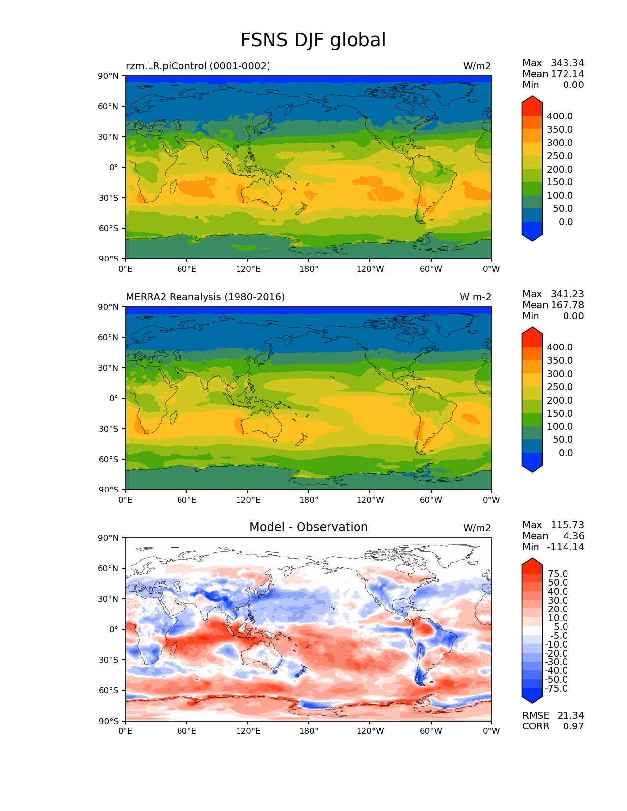 Use this command to recreate this image: | e3sm_diags lat_lon --no_viewer --case_id 'MERRA2' --sets 'lat_lon' --run_type 'model_vs_obs' --variables 'FSNS' --seasons 'DJF' --regions 'global' --regrid_tool 'esmf' --regrid_method 'conservative' --main_title 'FSNS DJF global' --backend 'mpl' --output_format 'png' --canvas_size_w '1212' --canvas_size_h '1628' --figsize '8.5' '11.0' --dpi '150' --arrows --contour_levels '0' '50' '100' '150' '200' '250' '300' '350' '400' --test_name 'rzm.LR.piControl' --test_title ' ' --test_colormap 'cet_rainbow.rgb' --ref_name 'MERRA2' --reference_name 'MERRA2 Reanalysis' --reference_colormap 'cet_rainbow.rgb' --diff_title 'Model - Observation' --diff_colormap 'diverging_bwr.rgb' --diff_levels '-75' '-50' '-40' '-30' '-20' '-10' '-5' '5' '10' '20' '30' '40' '50' '75' --num_workers '4' --granulate 'variables' 'seasons' 'plevs' 'regions' --selectors 'sets' 'seasons' --reference_data_path '/global/cfs/cdirs/e3sm/acme_diags/obs_for_e3sm_diags/climatology/' --test_data_path '/global/cscratch1/sd/xsongsio/E3SM_simulations/rzm.LR.piControl/diag/clim_rgr/2yr/' --results_dir '/global/cfs/cdirs/e3sm/www/xsongsio/rzm.LR.piControl/2yr' |