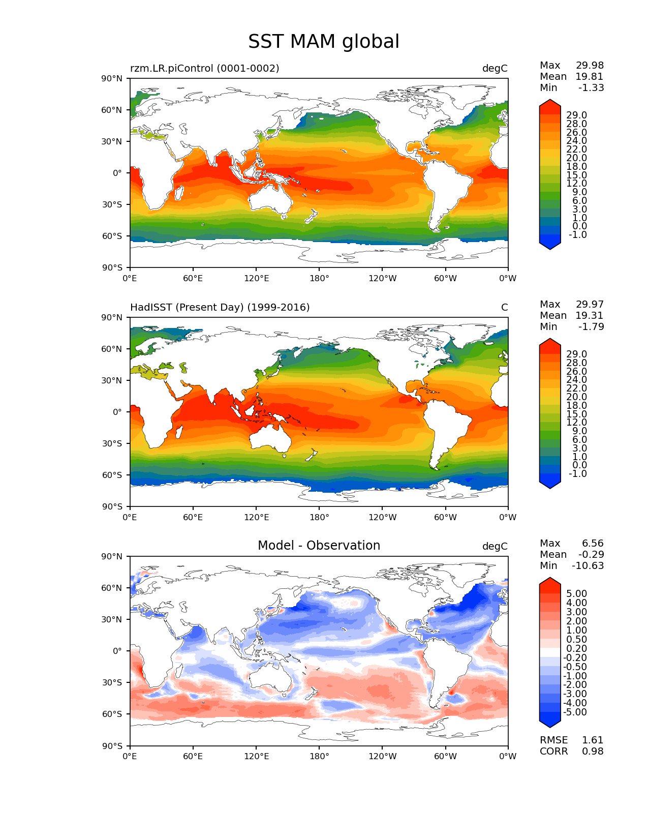 Use this command to recreate this image: | e3sm_diags lat_lon --no_viewer --case_id 'SST_PD_HadISST' --sets 'lat_lon' --run_type 'model_vs_obs' --variables 'SST' --seasons 'MAM' --regions 'global' --regrid_tool 'esmf' --regrid_method 'conservative' --main_title 'SST MAM global' --backend 'mpl' --output_format 'png' --canvas_size_w '1212' --canvas_size_h '1628' --figsize '8.5' '11.0' --dpi '150' --arrows --contour_levels '-1' '0' '1' '3' '6' '9' '12' '15' '18' '20' '22' '24' '26' '28' '29' --test_name 'rzm.LR.piControl' --test_title ' ' --test_colormap 'cet_rainbow.rgb' --ref_name 'HadISST_PD' --reference_name 'HadISST (Present Day)' --reference_colormap 'cet_rainbow.rgb' --diff_title 'Model - Observation' --diff_colormap 'diverging_bwr.rgb' --diff_levels '-5' '-4' '-3' '-2' '-1' '-0.5' '-0.2' '0.2' '0.5' '1' '2' '3' '4' '5' --num_workers '4' --granulate 'variables' 'seasons' 'plevs' 'regions' --selectors 'sets' 'seasons' --reference_data_path '/global/cfs/cdirs/e3sm/acme_diags/obs_for_e3sm_diags/climatology/' --test_data_path '/global/cscratch1/sd/xsongsio/E3SM_simulations/rzm.LR.piControl/diag/clim_rgr/2yr/' --results_dir '/global/cfs/cdirs/e3sm/www/xsongsio/rzm.LR.piControl/2yr' |