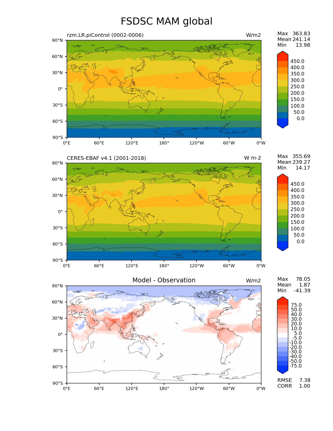Use this command to recreate this image: | e3sm_diags lat_lon --no_viewer --case_id 'CERES-EBAF-surface-v4.1' --sets 'lat_lon' --run_type 'model_vs_obs' --variables 'FSDSC' --seasons 'MAM' --regions 'global' --regrid_tool 'esmf' --regrid_method 'conservative' --main_title 'FSDSC MAM global' --backend 'mpl' --output_format 'png' --canvas_size_w '1212' --canvas_size_h '1628' --figsize '8.5' '11.0' --dpi '150' --arrows --contour_levels '0' '50' '100' '150' '200' '250' '300' '350' '400' '450' --test_name 'rzm.LR.piControl' --test_title ' ' --test_colormap 'cet_rainbow.rgb' --ref_name 'ceres_ebaf_surface_v4.1' --reference_name 'CERES-EBAF v4.1' --reference_colormap 'cet_rainbow.rgb' --diff_title 'Model - Observation' --diff_colormap 'diverging_bwr.rgb' --diff_levels '-75' '-50' '-40' '-30' '-20' '-10' '-5' '5' '10' '20' '30' '40' '50' '75' --num_workers '4' --granulate 'variables' 'seasons' 'plevs' 'regions' --selectors 'sets' 'seasons' --reference_data_path '/global/cfs/cdirs/e3sm/acme_diags/obs_for_e3sm_diags/climatology/' --test_data_path '/global/cscratch1/sd/xsongsio/E3SM_simulations/rzm.LR.piControl/diag/clim_rgr/5yr/' --results_dir '/global/cfs/cdirs/e3sm/www/xsongsio/rzm.LR.piControl/5yr' |