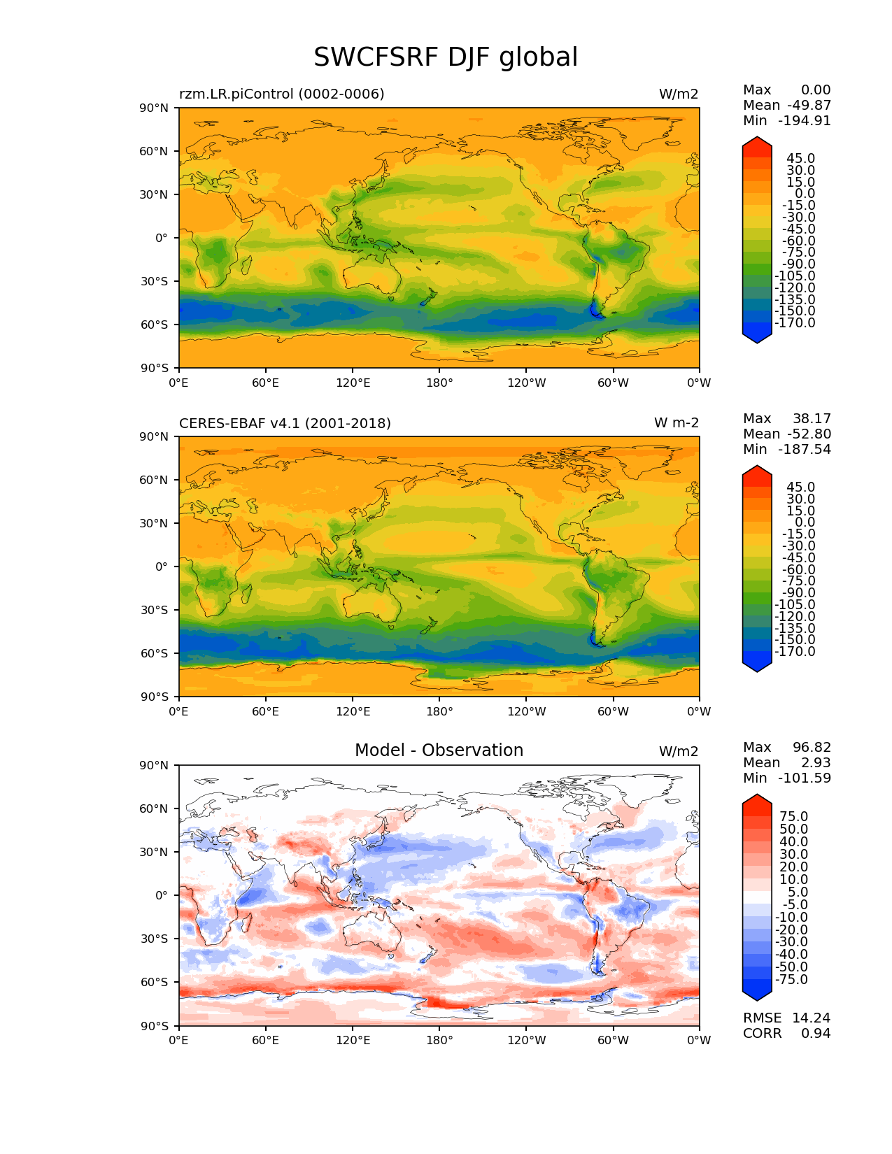 Use this command to recreate this image: | e3sm_diags lat_lon --no_viewer --case_id 'CERES-EBAF-surface-v4.1' --sets 'lat_lon' --run_type 'model_vs_obs' --variables 'SWCFSRF' --seasons 'DJF' --regions 'global' --regrid_tool 'esmf' --regrid_method 'conservative' --main_title 'SWCFSRF DJF global' --backend 'mpl' --output_format 'png' --canvas_size_w '1212' --canvas_size_h '1628' --figsize '8.5' '11.0' --dpi '150' --arrows --contour_levels '-170' '-150' '-135' '-120' '-105' '-90' '-75' '-60' '-45' '-30' '-15' '0' '15' '30' '45' --test_name 'rzm.LR.piControl' --test_title ' ' --test_colormap 'cet_rainbow.rgb' --ref_name 'ceres_ebaf_surface_v4.1' --reference_name 'CERES-EBAF v4.1' --reference_colormap 'cet_rainbow.rgb' --diff_title 'Model - Observation' --diff_colormap 'diverging_bwr.rgb' --diff_levels '-75' '-50' '-40' '-30' '-20' '-10' '-5' '5' '10' '20' '30' '40' '50' '75' --num_workers '4' --granulate 'variables' 'seasons' 'plevs' 'regions' --selectors 'sets' 'seasons' --reference_data_path '/global/cfs/cdirs/e3sm/acme_diags/obs_for_e3sm_diags/climatology/' --test_data_path '/global/cscratch1/sd/xsongsio/E3SM_simulations/rzm.LR.piControl/diag/clim_rgr/5yr/' --results_dir '/global/cfs/cdirs/e3sm/www/xsongsio/rzm.LR.piControl/5yr' |