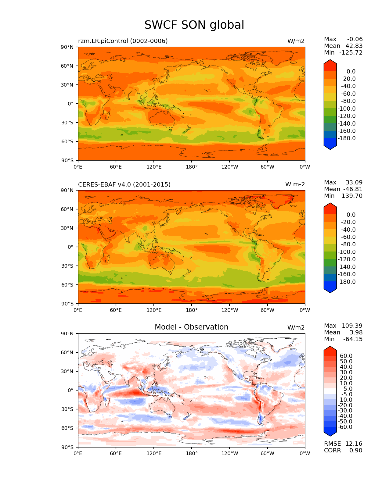 Use this command to recreate this image: | e3sm_diags lat_lon --no_viewer --case_id 'CERES-EBAF-TOA-v4.0' --sets 'lat_lon' --run_type 'model_vs_obs' --variables 'SWCF' --seasons 'SON' --regions 'global' --regrid_tool 'esmf' --regrid_method 'conservative' --main_title 'SWCF SON global' --backend 'mpl' --output_format 'png' --canvas_size_w '1212' --canvas_size_h '1628' --figsize '8.5' '11.0' --dpi '150' --arrows --contour_levels '-180' '-160' '-140' '-120' '-100' '-80' '-60' '-40' '-20' '0' --test_name 'rzm.LR.piControl' --test_title ' ' --test_colormap 'cet_rainbow.rgb' --ref_name 'ceres_ebaf_toa_v4.0' --reference_name 'CERES-EBAF v4.0' --reference_colormap 'cet_rainbow.rgb' --diff_title 'Model - Observation' --diff_colormap 'diverging_bwr.rgb' --diff_levels '-60' '-50' '-40' '-30' '-20' '-10' '-5' '5' '10' '20' '30' '40' '50' '60' --num_workers '4' --granulate 'variables' 'seasons' 'plevs' 'regions' --selectors 'sets' 'seasons' --reference_data_path '/global/cfs/cdirs/e3sm/acme_diags/obs_for_e3sm_diags/climatology/' --test_data_path '/global/cscratch1/sd/xsongsio/E3SM_simulations/rzm.LR.piControl/diag/clim_rgr/5yr/' --results_dir '/global/cfs/cdirs/e3sm/www/xsongsio/rzm.LR.piControl/5yr' |