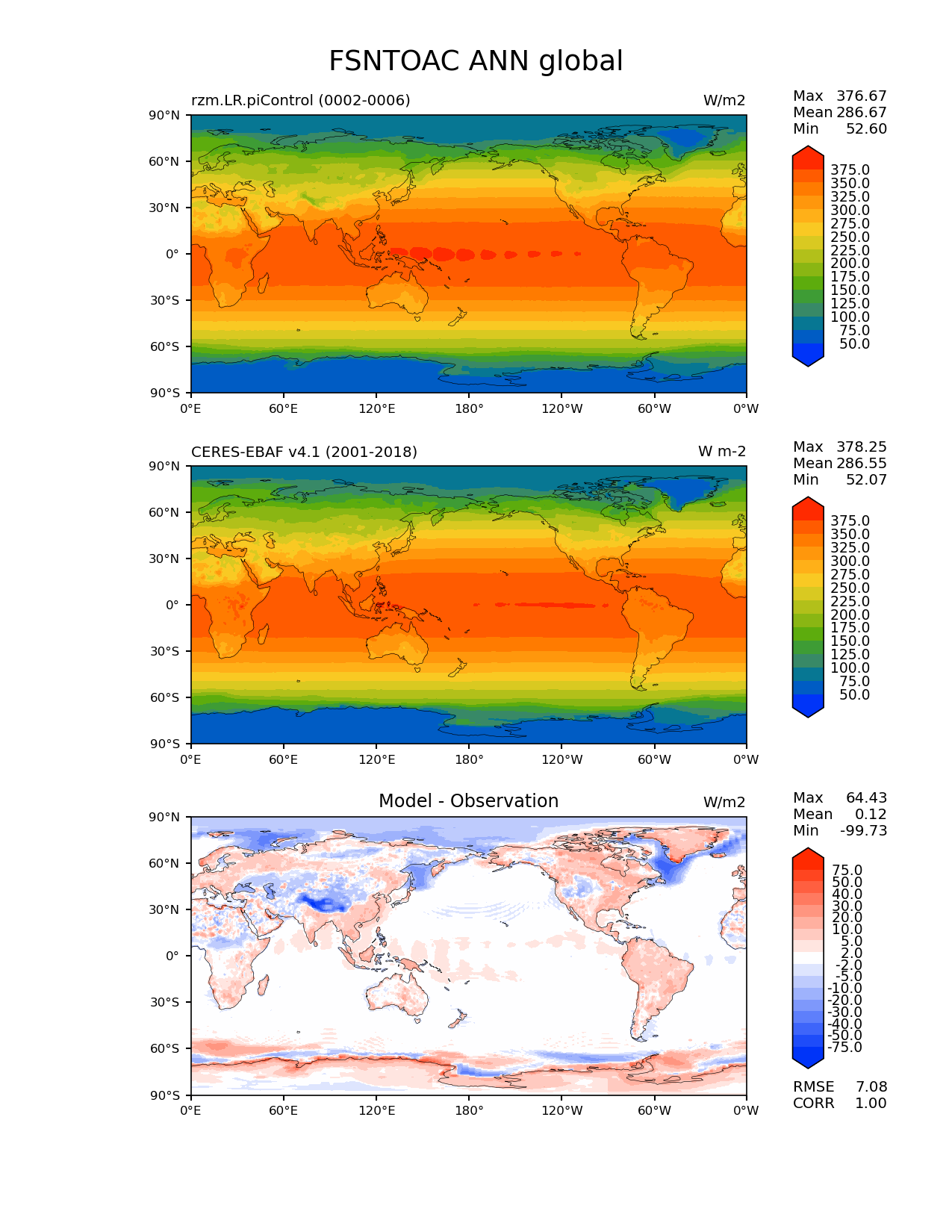Use this command to recreate this image: | e3sm_diags lat_lon --no_viewer --case_id 'CERES-EBAF-TOA-v4.1' --sets 'lat_lon' --run_type 'model_vs_obs' --variables 'FSNTOAC' --seasons 'ANN' --regions 'global' --regrid_tool 'esmf' --regrid_method 'conservative' --main_title 'FSNTOAC ANN global' --backend 'mpl' --output_format 'png' --canvas_size_w '1212' --canvas_size_h '1628' --figsize '8.5' '11.0' --dpi '150' --arrows --contour_levels '50' '75' '100' '125' '150' '175' '200' '225' '250' '275' '300' '325' '350' '375' --test_name 'rzm.LR.piControl' --test_title ' ' --test_colormap 'cet_rainbow.rgb' --ref_name 'ceres_ebaf_toa_v4.1' --reference_name 'CERES-EBAF v4.1' --reference_colormap 'cet_rainbow.rgb' --diff_title 'Model - Observation' --diff_colormap 'diverging_bwr.rgb' --diff_levels '-75' '-50' '-40' '-30' '-20' '-10' '-5' '-2' '2' '5' '10' '20' '30' '40' '50' '75' --num_workers '4' --granulate 'variables' 'seasons' 'plevs' 'regions' --selectors 'sets' 'seasons' --reference_data_path '/global/cfs/cdirs/e3sm/acme_diags/obs_for_e3sm_diags/climatology/' --test_data_path '/global/cscratch1/sd/xsongsio/E3SM_simulations/rzm.LR.piControl/diag/clim_rgr/5yr/' --results_dir '/global/cfs/cdirs/e3sm/www/xsongsio/rzm.LR.piControl/5yr' |