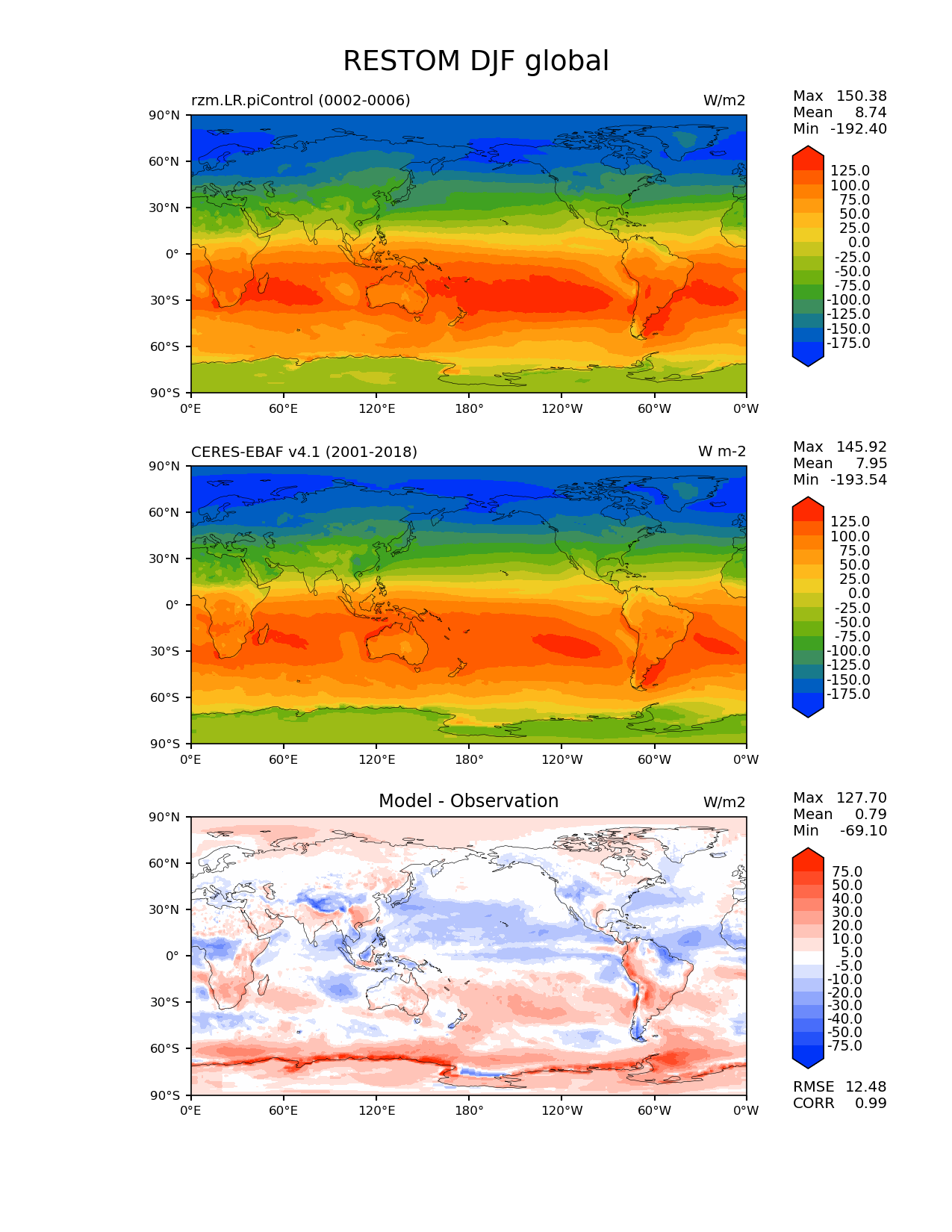 Use this command to recreate this image: | e3sm_diags lat_lon --no_viewer --case_id 'CERES-EBAF-TOA-v4.1' --sets 'lat_lon' --run_type 'model_vs_obs' --variables 'RESTOM' --seasons 'DJF' --regions 'global' --regrid_tool 'esmf' --regrid_method 'conservative' --main_title 'RESTOM DJF global' --backend 'mpl' --output_format 'png' --canvas_size_w '1212' --canvas_size_h '1628' --figsize '8.5' '11.0' --dpi '150' --arrows --contour_levels '-175' '-150' '-125' '-100' '-75' '-50' '-25' '0' '25' '50' '75' '100' '125' --test_name 'rzm.LR.piControl' --test_title ' ' --test_colormap 'cet_rainbow.rgb' --ref_name 'ceres_ebaf_toa_v4.1' --reference_name 'CERES-EBAF v4.1' --reference_colormap 'cet_rainbow.rgb' --diff_title 'Model - Observation' --diff_colormap 'diverging_bwr.rgb' --diff_levels '-75' '-50' '-40' '-30' '-20' '-10' '-5' '5' '10' '20' '30' '40' '50' '75' --num_workers '4' --granulate 'variables' 'seasons' 'plevs' 'regions' --selectors 'sets' 'seasons' --reference_data_path '/global/cfs/cdirs/e3sm/acme_diags/obs_for_e3sm_diags/climatology/' --test_data_path '/global/cscratch1/sd/xsongsio/E3SM_simulations/rzm.LR.piControl/diag/clim_rgr/5yr/' --results_dir '/global/cfs/cdirs/e3sm/www/xsongsio/rzm.LR.piControl/5yr' |