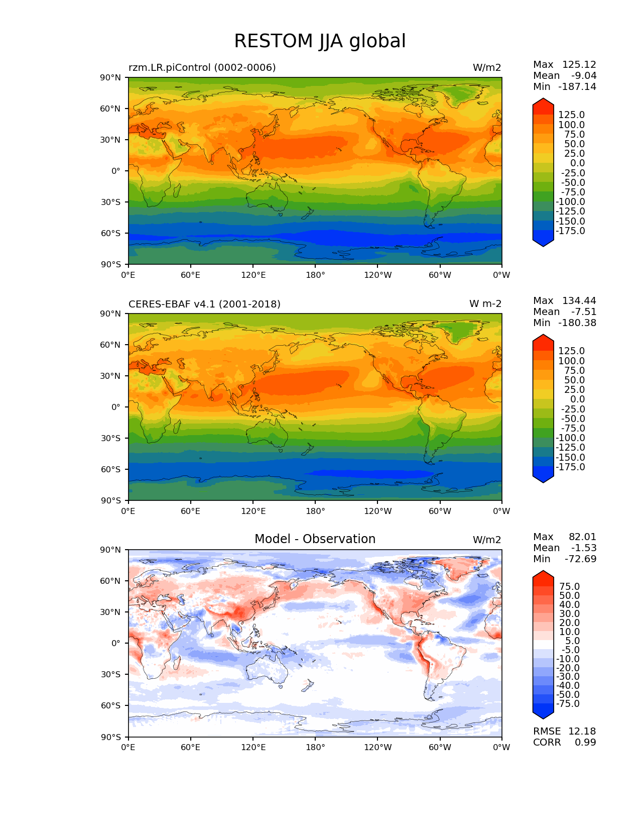 Use this command to recreate this image: | e3sm_diags lat_lon --no_viewer --case_id 'CERES-EBAF-TOA-v4.1' --sets 'lat_lon' --run_type 'model_vs_obs' --variables 'RESTOM' --seasons 'JJA' --regions 'global' --regrid_tool 'esmf' --regrid_method 'conservative' --main_title 'RESTOM JJA global' --backend 'mpl' --output_format 'png' --canvas_size_w '1212' --canvas_size_h '1628' --figsize '8.5' '11.0' --dpi '150' --arrows --contour_levels '-175' '-150' '-125' '-100' '-75' '-50' '-25' '0' '25' '50' '75' '100' '125' --test_name 'rzm.LR.piControl' --test_title ' ' --test_colormap 'cet_rainbow.rgb' --ref_name 'ceres_ebaf_toa_v4.1' --reference_name 'CERES-EBAF v4.1' --reference_colormap 'cet_rainbow.rgb' --diff_title 'Model - Observation' --diff_colormap 'diverging_bwr.rgb' --diff_levels '-75' '-50' '-40' '-30' '-20' '-10' '-5' '5' '10' '20' '30' '40' '50' '75' --num_workers '4' --granulate 'variables' 'seasons' 'plevs' 'regions' --selectors 'sets' 'seasons' --reference_data_path '/global/cfs/cdirs/e3sm/acme_diags/obs_for_e3sm_diags/climatology/' --test_data_path '/global/cscratch1/sd/xsongsio/E3SM_simulations/rzm.LR.piControl/diag/clim_rgr/5yr/' --results_dir '/global/cfs/cdirs/e3sm/www/xsongsio/rzm.LR.piControl/5yr' |