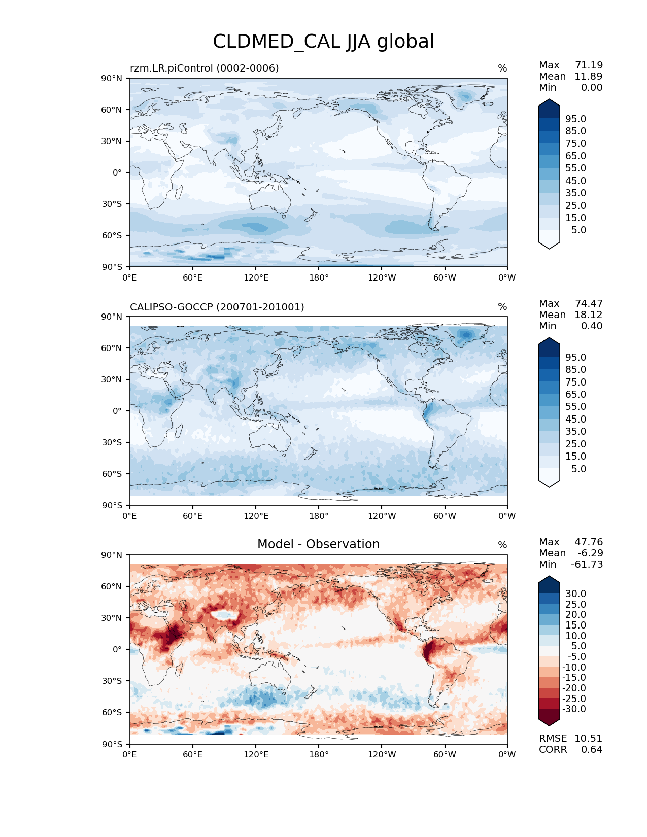 Use this command to recreate this image: | e3sm_diags lat_lon --no_viewer --case_id 'Cloud Calipso' --sets 'lat_lon' --run_type 'model_vs_obs' --variables 'CLDMED_CAL' --seasons 'JJA' --regions 'global' --regrid_tool 'esmf' --regrid_method 'conservative' --main_title 'CLDMED_CAL JJA global' --backend 'mpl' --output_format 'png' --canvas_size_w '1212' --canvas_size_h '1628' --figsize '8.5' '11.0' --dpi '150' --arrows --contour_levels '5' '15' '25' '35' '45' '55' '65' '75' '85' '95' --test_name 'rzm.LR.piControl' --test_title ' ' --test_colormap 'Blues' --ref_name 'CALIPSOCOSP' --reference_name 'CALIPSO-GOCCP' --reference_colormap 'Blues' --diff_title 'Model - Observation' --diff_colormap 'RdBu' --diff_levels '-30' '-25' '-20' '-15' '-10' '-5' '5' '10' '15' '20' '25' '30' --num_workers '4' --granulate 'variables' 'seasons' 'plevs' 'regions' --selectors 'sets' 'seasons' --reference_data_path '/global/cfs/cdirs/e3sm/acme_diags/obs_for_e3sm_diags/climatology/' --test_data_path '/global/cscratch1/sd/xsongsio/E3SM_simulations/rzm.LR.piControl/diag/clim_rgr/5yr/' --results_dir '/global/cfs/cdirs/e3sm/www/xsongsio/rzm.LR.piControl/5yr' |