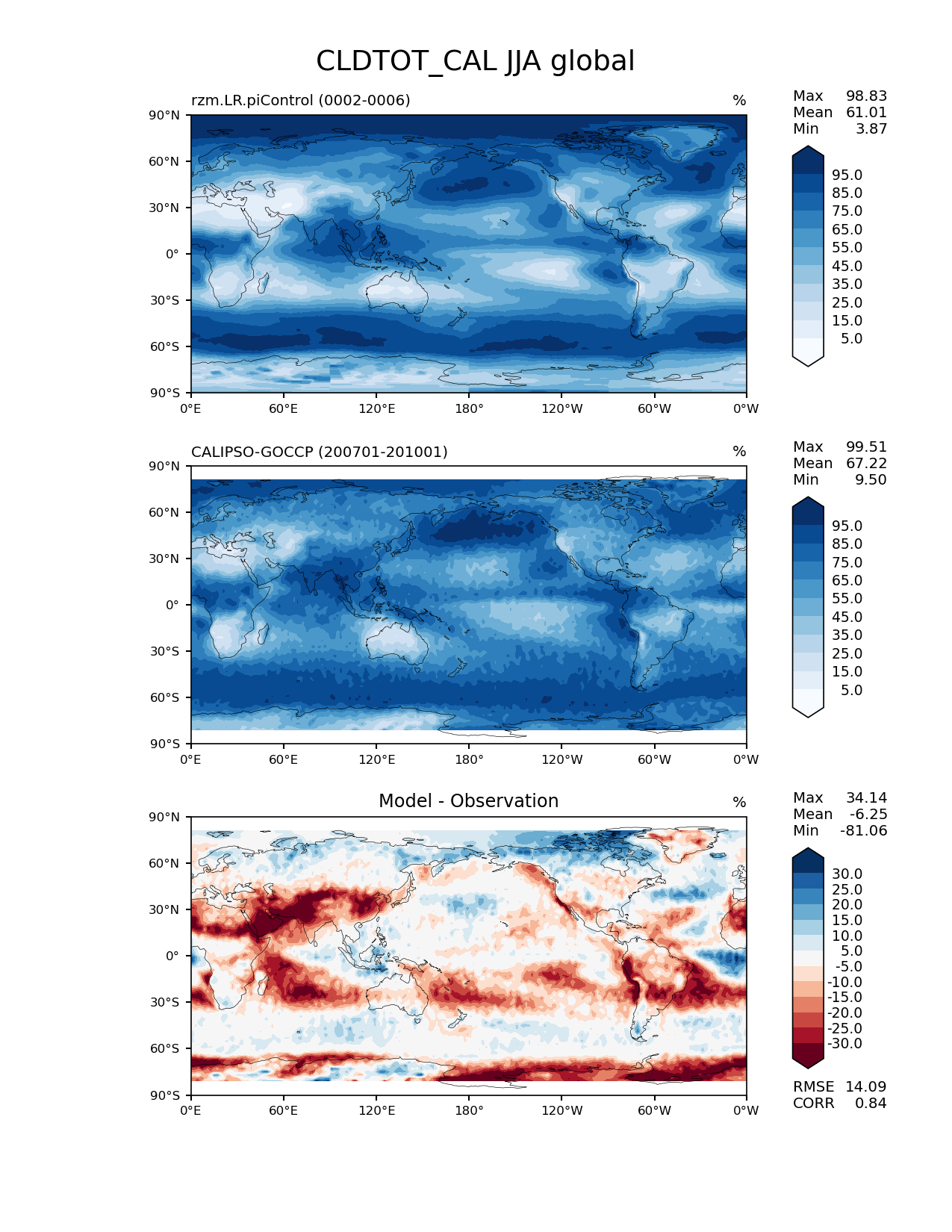 Use this command to recreate this image: | e3sm_diags lat_lon --no_viewer --case_id 'Cloud Calipso' --sets 'lat_lon' --run_type 'model_vs_obs' --variables 'CLDTOT_CAL' --seasons 'JJA' --regions 'global' --regrid_tool 'esmf' --regrid_method 'conservative' --main_title 'CLDTOT_CAL JJA global' --backend 'mpl' --output_format 'png' --canvas_size_w '1212' --canvas_size_h '1628' --figsize '8.5' '11.0' --dpi '150' --arrows --contour_levels '5' '15' '25' '35' '45' '55' '65' '75' '85' '95' --test_name 'rzm.LR.piControl' --test_title ' ' --test_colormap 'Blues' --ref_name 'CALIPSOCOSP' --reference_name 'CALIPSO-GOCCP' --reference_colormap 'Blues' --diff_title 'Model - Observation' --diff_colormap 'RdBu' --diff_levels '-30' '-25' '-20' '-15' '-10' '-5' '5' '10' '15' '20' '25' '30' --num_workers '4' --granulate 'variables' 'seasons' 'plevs' 'regions' --selectors 'sets' 'seasons' --reference_data_path '/global/cfs/cdirs/e3sm/acme_diags/obs_for_e3sm_diags/climatology/' --test_data_path '/global/cscratch1/sd/xsongsio/E3SM_simulations/rzm.LR.piControl/diag/clim_rgr/5yr/' --results_dir '/global/cfs/cdirs/e3sm/www/xsongsio/rzm.LR.piControl/5yr' |