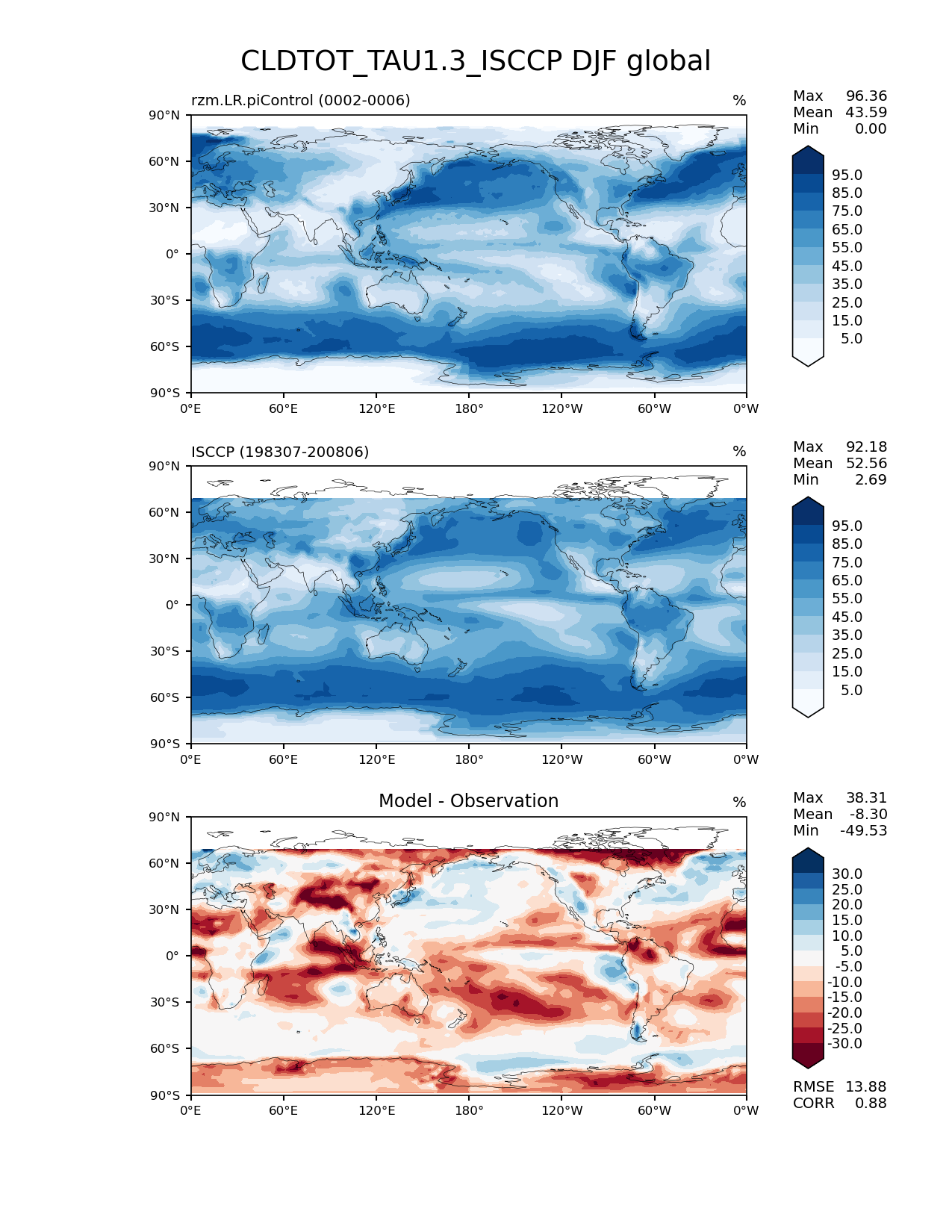 Use this command to recreate this image: | e3sm_diags lat_lon --no_viewer --case_id 'Cloud ISCCP' --sets 'lat_lon' --run_type 'model_vs_obs' --variables 'CLDTOT_TAU1.3_ISCCP' --seasons 'DJF' --regions 'global' --regrid_tool 'esmf' --regrid_method 'conservative' --main_title 'CLDTOT_TAU1.3_ISCCP DJF global' --backend 'mpl' --output_format 'png' --canvas_size_w '1212' --canvas_size_h '1628' --figsize '8.5' '11.0' --dpi '150' --arrows --contour_levels '5' '15' '25' '35' '45' '55' '65' '75' '85' '95' --test_name 'rzm.LR.piControl' --test_title ' ' --test_colormap 'Blues' --ref_name 'ISCCPCOSP' --reference_name 'ISCCP' --reference_colormap 'Blues' --diff_title 'Model - Observation' --diff_colormap 'RdBu' --diff_levels '-30' '-25' '-20' '-15' '-10' '-5' '5' '10' '15' '20' '25' '30' --num_workers '4' --granulate 'variables' 'seasons' 'plevs' 'regions' --selectors 'sets' 'seasons' --reference_data_path '/global/cfs/cdirs/e3sm/acme_diags/obs_for_e3sm_diags/climatology/' --test_data_path '/global/cscratch1/sd/xsongsio/E3SM_simulations/rzm.LR.piControl/diag/clim_rgr/5yr/' --results_dir '/global/cfs/cdirs/e3sm/www/xsongsio/rzm.LR.piControl/5yr' |