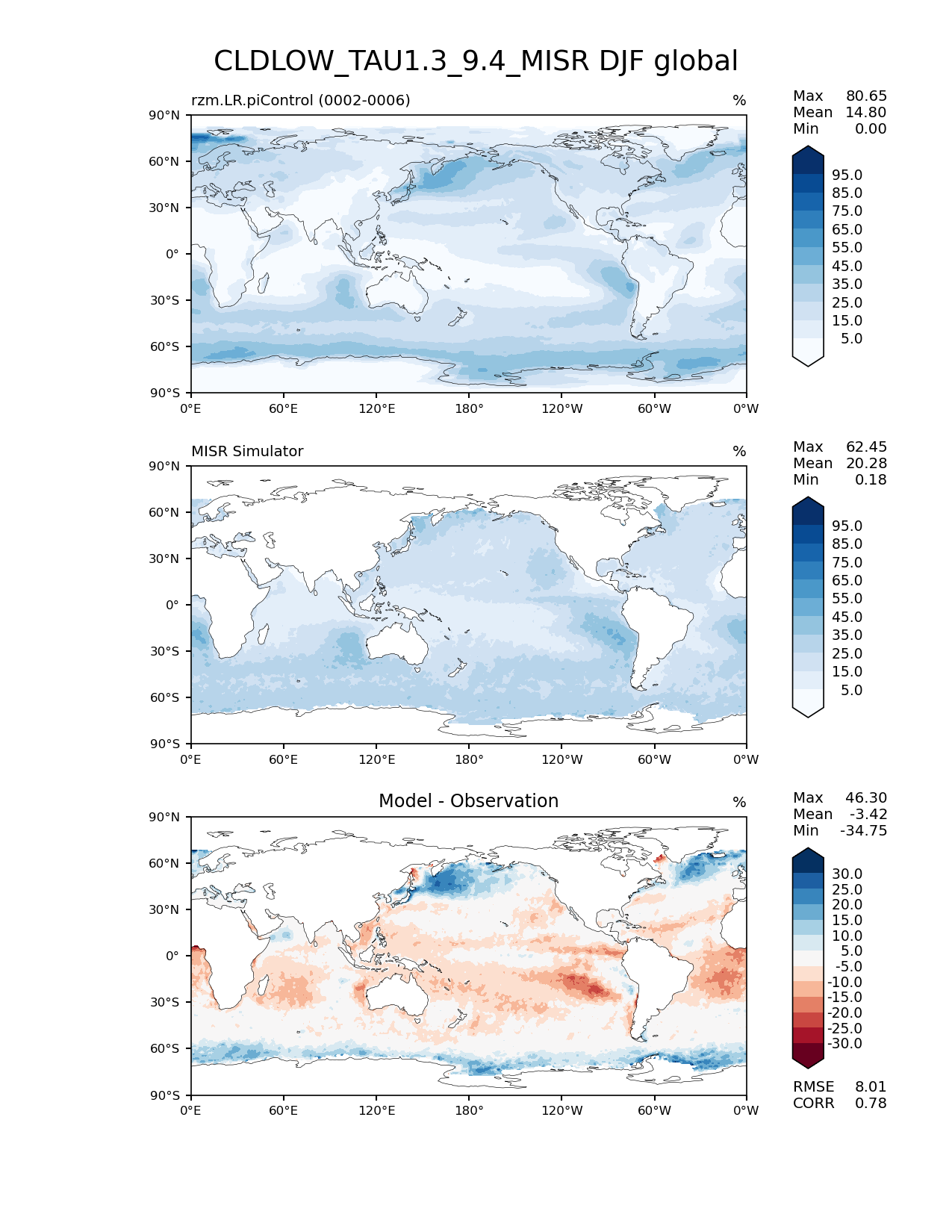 Use this command to recreate this image: | e3sm_diags lat_lon --no_viewer --case_id 'Cloud MISR' --sets 'lat_lon' --run_type 'model_vs_obs' --variables 'CLDLOW_TAU1.3_9.4_MISR' --seasons 'DJF' --regions 'global' --regrid_tool 'esmf' --regrid_method 'conservative' --main_title 'CLDLOW_TAU1.3_9.4_MISR DJF global' --backend 'mpl' --output_format 'png' --canvas_size_w '1212' --canvas_size_h '1628' --figsize '8.5' '11.0' --dpi '150' --arrows --contour_levels '5' '15' '25' '35' '45' '55' '65' '75' '85' '95' --test_name 'rzm.LR.piControl' --test_title ' ' --test_colormap 'Blues' --ref_name 'MISRCOSP' --reference_name 'MISR Simulator' --reference_colormap 'Blues' --diff_title 'Model - Observation' --diff_colormap 'RdBu' --diff_levels '-30' '-25' '-20' '-15' '-10' '-5' '5' '10' '15' '20' '25' '30' --num_workers '4' --granulate 'variables' 'seasons' 'plevs' 'regions' --selectors 'sets' 'seasons' --reference_data_path '/global/cfs/cdirs/e3sm/acme_diags/obs_for_e3sm_diags/climatology/' --test_data_path '/global/cscratch1/sd/xsongsio/E3SM_simulations/rzm.LR.piControl/diag/clim_rgr/5yr/' --results_dir '/global/cfs/cdirs/e3sm/www/xsongsio/rzm.LR.piControl/5yr' |