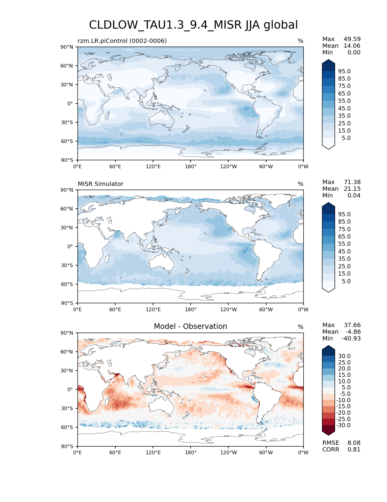 Use this command to recreate this image: | e3sm_diags lat_lon --no_viewer --case_id 'Cloud MISR' --sets 'lat_lon' --run_type 'model_vs_obs' --variables 'CLDLOW_TAU1.3_9.4_MISR' --seasons 'JJA' --regions 'global' --regrid_tool 'esmf' --regrid_method 'conservative' --main_title 'CLDLOW_TAU1.3_9.4_MISR JJA global' --backend 'mpl' --output_format 'png' --canvas_size_w '1212' --canvas_size_h '1628' --figsize '8.5' '11.0' --dpi '150' --arrows --contour_levels '5' '15' '25' '35' '45' '55' '65' '75' '85' '95' --test_name 'rzm.LR.piControl' --test_title ' ' --test_colormap 'Blues' --ref_name 'MISRCOSP' --reference_name 'MISR Simulator' --reference_colormap 'Blues' --diff_title 'Model - Observation' --diff_colormap 'RdBu' --diff_levels '-30' '-25' '-20' '-15' '-10' '-5' '5' '10' '15' '20' '25' '30' --num_workers '4' --granulate 'variables' 'seasons' 'plevs' 'regions' --selectors 'sets' 'seasons' --reference_data_path '/global/cfs/cdirs/e3sm/acme_diags/obs_for_e3sm_diags/climatology/' --test_data_path '/global/cscratch1/sd/xsongsio/E3SM_simulations/rzm.LR.piControl/diag/clim_rgr/5yr/' --results_dir '/global/cfs/cdirs/e3sm/www/xsongsio/rzm.LR.piControl/5yr' |