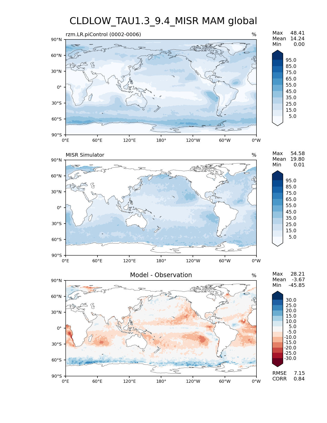 Use this command to recreate this image: | e3sm_diags lat_lon --no_viewer --case_id 'Cloud MISR' --sets 'lat_lon' --run_type 'model_vs_obs' --variables 'CLDLOW_TAU1.3_9.4_MISR' --seasons 'MAM' --regions 'global' --regrid_tool 'esmf' --regrid_method 'conservative' --main_title 'CLDLOW_TAU1.3_9.4_MISR MAM global' --backend 'mpl' --output_format 'png' --canvas_size_w '1212' --canvas_size_h '1628' --figsize '8.5' '11.0' --dpi '150' --arrows --contour_levels '5' '15' '25' '35' '45' '55' '65' '75' '85' '95' --test_name 'rzm.LR.piControl' --test_title ' ' --test_colormap 'Blues' --ref_name 'MISRCOSP' --reference_name 'MISR Simulator' --reference_colormap 'Blues' --diff_title 'Model - Observation' --diff_colormap 'RdBu' --diff_levels '-30' '-25' '-20' '-15' '-10' '-5' '5' '10' '15' '20' '25' '30' --num_workers '4' --granulate 'variables' 'seasons' 'plevs' 'regions' --selectors 'sets' 'seasons' --reference_data_path '/global/cfs/cdirs/e3sm/acme_diags/obs_for_e3sm_diags/climatology/' --test_data_path '/global/cscratch1/sd/xsongsio/E3SM_simulations/rzm.LR.piControl/diag/clim_rgr/5yr/' --results_dir '/global/cfs/cdirs/e3sm/www/xsongsio/rzm.LR.piControl/5yr' |