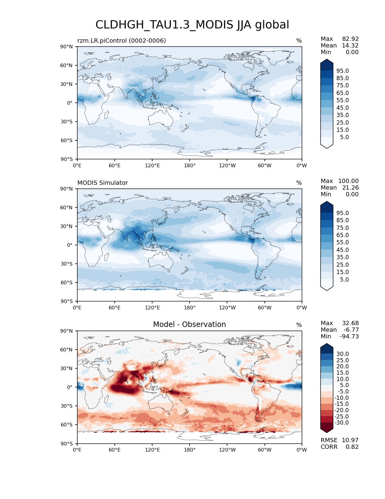 Use this command to recreate this image: | e3sm_diags lat_lon --no_viewer --case_id 'Cloud MODIS' --sets 'lat_lon' --run_type 'model_vs_obs' --variables 'CLDHGH_TAU1.3_MODIS' --seasons 'JJA' --regions 'global' --regrid_tool 'esmf' --regrid_method 'conservative' --main_title 'CLDHGH_TAU1.3_MODIS JJA global' --backend 'mpl' --output_format 'png' --canvas_size_w '1212' --canvas_size_h '1628' --figsize '8.5' '11.0' --dpi '150' --arrows --contour_levels '5' '15' '25' '35' '45' '55' '65' '75' '85' '95' --test_name 'rzm.LR.piControl' --test_title ' ' --test_colormap 'Blues' --ref_name 'MODISCOSP' --reference_name 'MODIS Simulator' --reference_colormap 'Blues' --diff_title 'Model - Observation' --diff_colormap 'RdBu' --diff_levels '-30' '-25' '-20' '-15' '-10' '-5' '5' '10' '15' '20' '25' '30' --num_workers '4' --granulate 'variables' 'seasons' 'plevs' 'regions' --selectors 'sets' 'seasons' --reference_data_path '/global/cfs/cdirs/e3sm/acme_diags/obs_for_e3sm_diags/climatology/' --test_data_path '/global/cscratch1/sd/xsongsio/E3SM_simulations/rzm.LR.piControl/diag/clim_rgr/5yr/' --results_dir '/global/cfs/cdirs/e3sm/www/xsongsio/rzm.LR.piControl/5yr' |