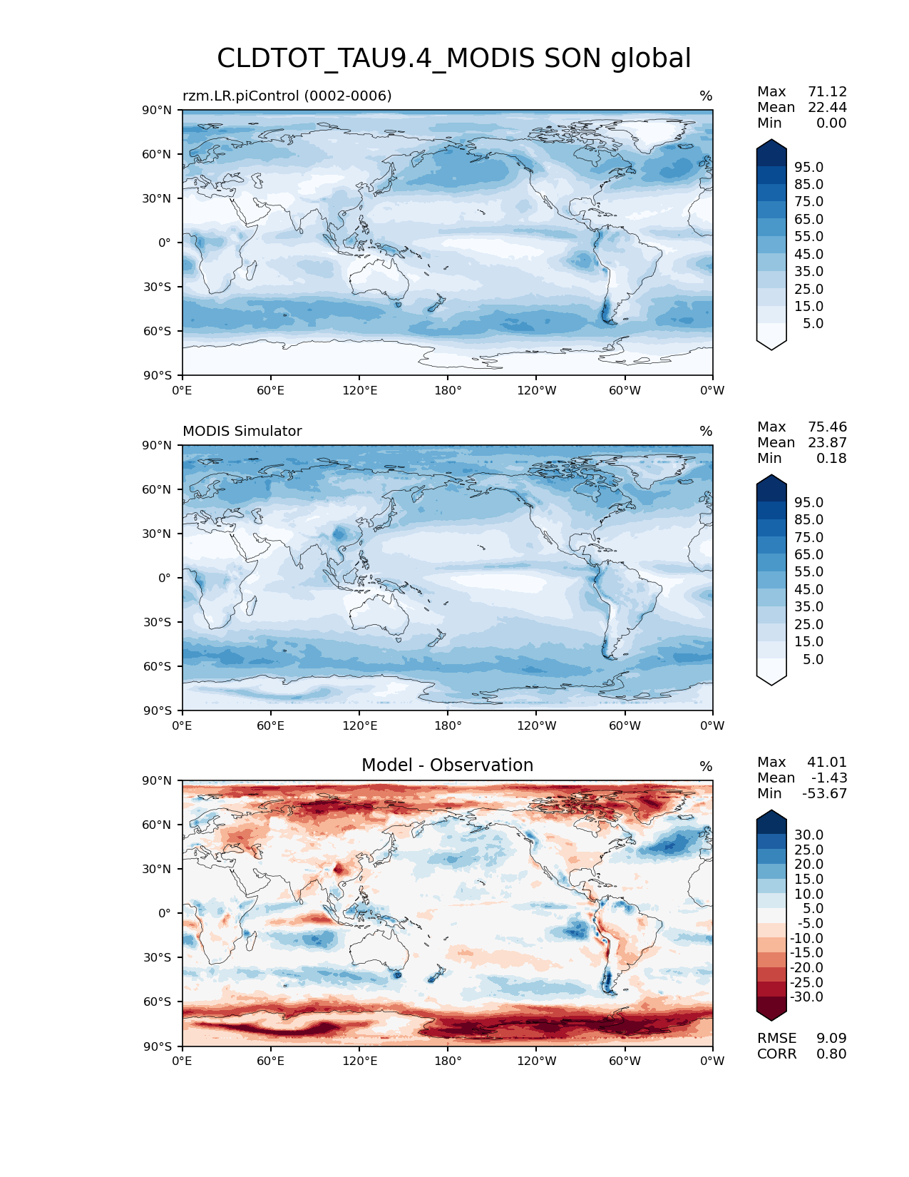 Use this command to recreate this image: | e3sm_diags lat_lon --no_viewer --case_id 'Cloud MODIS' --sets 'lat_lon' --run_type 'model_vs_obs' --variables 'CLDTOT_TAU9.4_MODIS' --seasons 'SON' --regions 'global' --regrid_tool 'esmf' --regrid_method 'conservative' --main_title 'CLDTOT_TAU9.4_MODIS SON global' --backend 'mpl' --output_format 'png' --canvas_size_w '1212' --canvas_size_h '1628' --figsize '8.5' '11.0' --dpi '150' --arrows --contour_levels '5' '15' '25' '35' '45' '55' '65' '75' '85' '95' --test_name 'rzm.LR.piControl' --test_title ' ' --test_colormap 'Blues' --ref_name 'MODISCOSP' --reference_name 'MODIS Simulator' --reference_colormap 'Blues' --diff_title 'Model - Observation' --diff_colormap 'RdBu' --diff_levels '-30' '-25' '-20' '-15' '-10' '-5' '5' '10' '15' '20' '25' '30' --num_workers '4' --granulate 'variables' 'seasons' 'plevs' 'regions' --selectors 'sets' 'seasons' --reference_data_path '/global/cfs/cdirs/e3sm/acme_diags/obs_for_e3sm_diags/climatology/' --test_data_path '/global/cscratch1/sd/xsongsio/E3SM_simulations/rzm.LR.piControl/diag/clim_rgr/5yr/' --results_dir '/global/cfs/cdirs/e3sm/www/xsongsio/rzm.LR.piControl/5yr' |