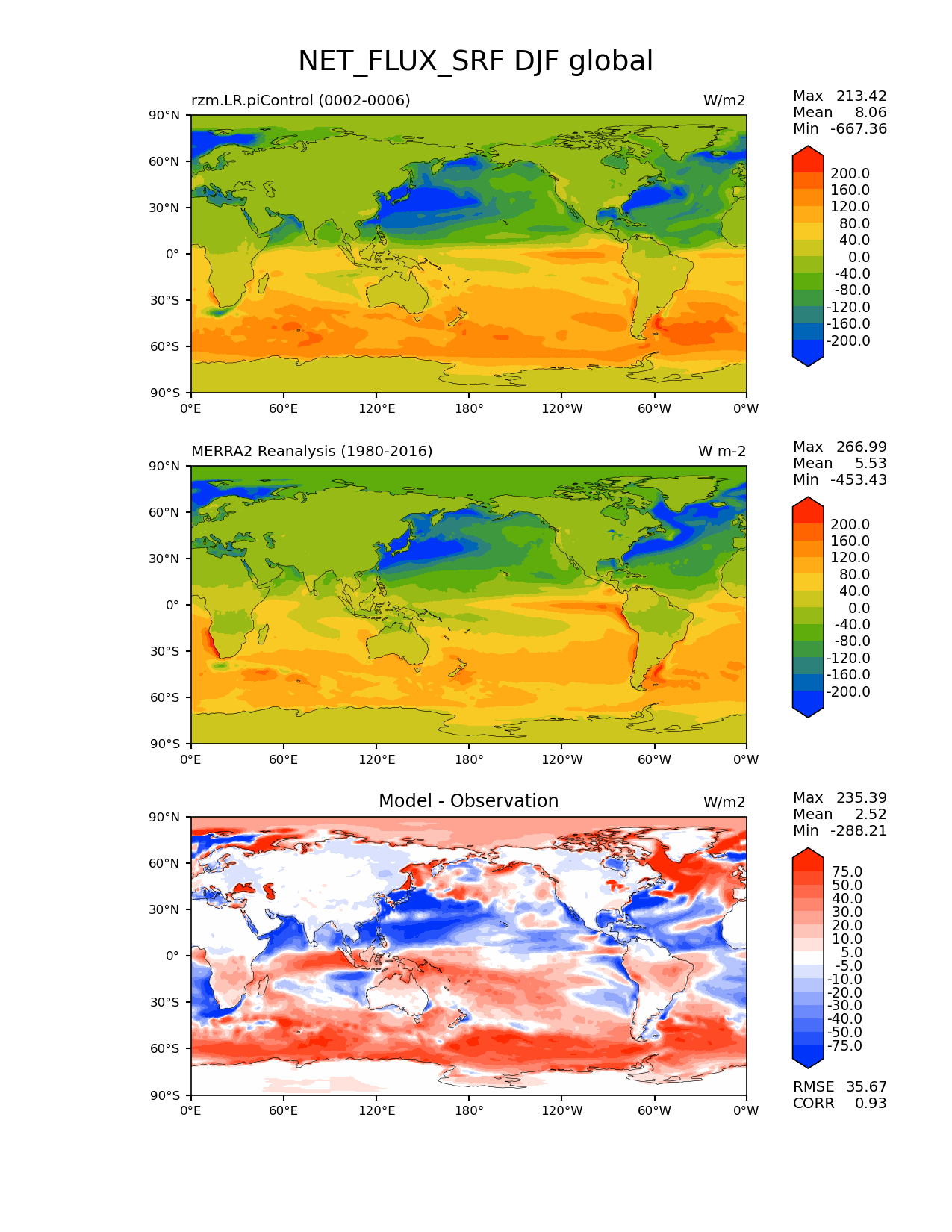 Use this command to recreate this image: | e3sm_diags lat_lon --no_viewer --case_id 'MERRA2' --sets 'lat_lon' --run_type 'model_vs_obs' --variables 'NET_FLUX_SRF' --seasons 'DJF' --regions 'global' --regrid_tool 'esmf' --regrid_method 'conservative' --main_title 'NET_FLUX_SRF DJF global' --backend 'mpl' --output_format 'png' --canvas_size_w '1212' --canvas_size_h '1628' --figsize '8.5' '11.0' --dpi '150' --arrows --contour_levels '-200' '-160' '-120' '-80' '-40' '0' '40' '80' '120' '160' '200' --test_name 'rzm.LR.piControl' --test_title ' ' --test_colormap 'cet_rainbow.rgb' --ref_name 'MERRA2' --reference_name 'MERRA2 Reanalysis' --reference_colormap 'cet_rainbow.rgb' --diff_title 'Model - Observation' --diff_colormap 'diverging_bwr.rgb' --diff_levels '-75' '-50' '-40' '-30' '-20' '-10' '-5' '5' '10' '20' '30' '40' '50' '75' --num_workers '4' --granulate 'variables' 'seasons' 'plevs' 'regions' --selectors 'sets' 'seasons' --reference_data_path '/global/cfs/cdirs/e3sm/acme_diags/obs_for_e3sm_diags/climatology/' --test_data_path '/global/cscratch1/sd/xsongsio/E3SM_simulations/rzm.LR.piControl/diag/clim_rgr/5yr/' --results_dir '/global/cfs/cdirs/e3sm/www/xsongsio/rzm.LR.piControl/5yr' |