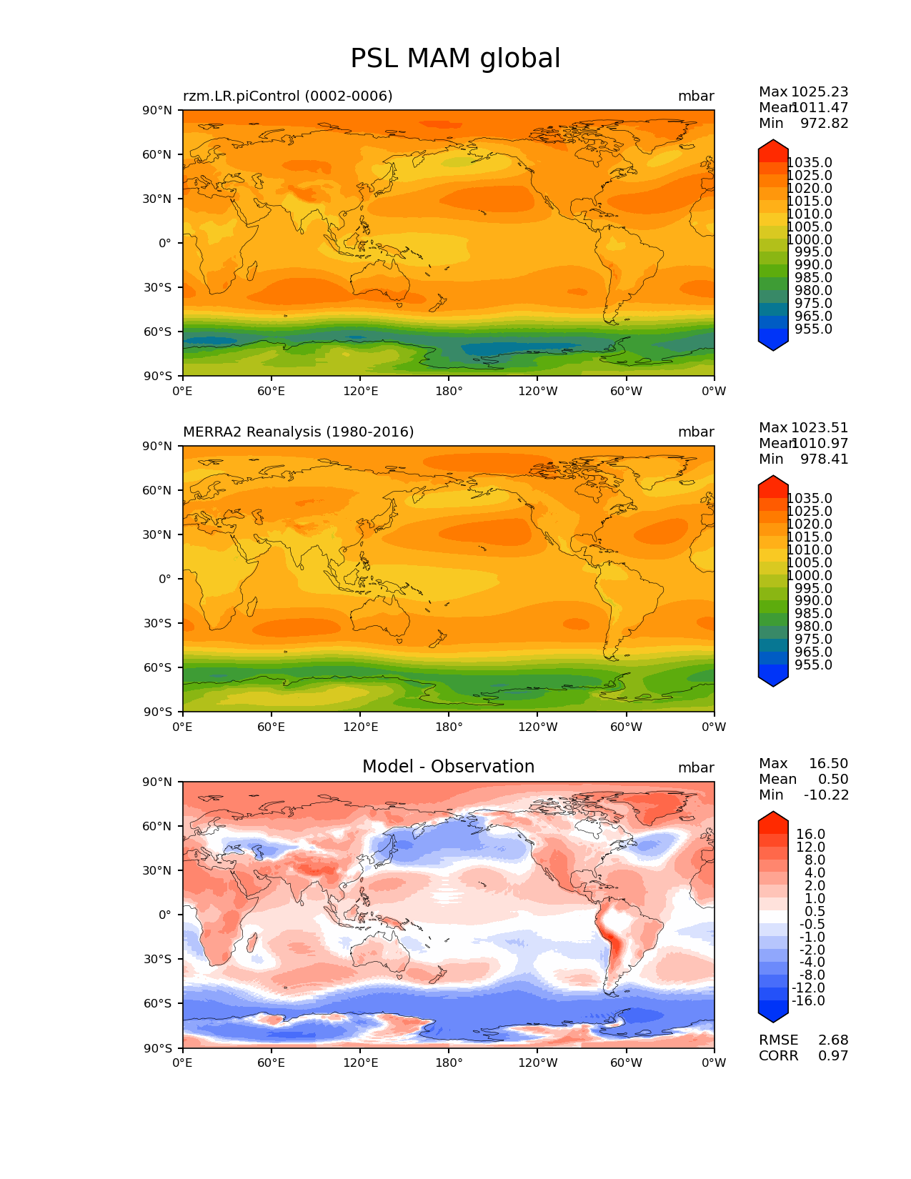 Use this command to recreate this image: | e3sm_diags lat_lon --no_viewer --case_id 'MERRA2' --sets 'lat_lon' --run_type 'model_vs_obs' --variables 'PSL' --seasons 'MAM' --regions 'global' --regrid_tool 'esmf' --regrid_method 'conservative' --main_title 'PSL MAM global' --backend 'mpl' --output_format 'png' --canvas_size_w '1212' --canvas_size_h '1628' --figsize '8.5' '11.0' --dpi '150' --arrows --contour_levels '955' '965' '975' '980' '985' '990' '995' '1000' '1005' '1010' '1015' '1020' '1025' '1035' --test_name 'rzm.LR.piControl' --test_title ' ' --test_colormap 'cet_rainbow.rgb' --ref_name 'MERRA2' --reference_name 'MERRA2 Reanalysis' --reference_colormap 'cet_rainbow.rgb' --diff_title 'Model - Observation' --diff_colormap 'diverging_bwr.rgb' --diff_levels '-16' '-12' '-8' '-4' '-2' '-1' '-0.5' '0.5' '1' '2' '4' '8' '12' '16' --num_workers '4' --granulate 'variables' 'seasons' 'plevs' 'regions' --selectors 'sets' 'seasons' --reference_data_path '/global/cfs/cdirs/e3sm/acme_diags/obs_for_e3sm_diags/climatology/' --test_data_path '/global/cscratch1/sd/xsongsio/E3SM_simulations/rzm.LR.piControl/diag/clim_rgr/5yr/' --results_dir '/global/cfs/cdirs/e3sm/www/xsongsio/rzm.LR.piControl/5yr' |