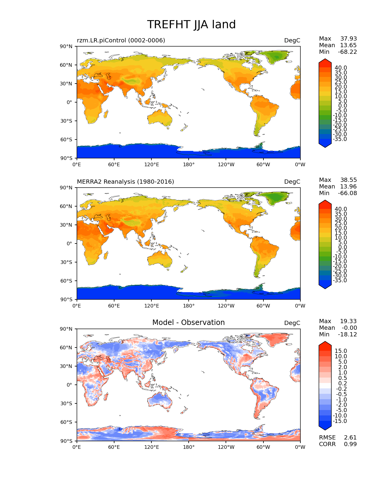 Use this command to recreate this image: | e3sm_diags lat_lon --no_viewer --case_id 'MERRA2' --sets 'lat_lon' --run_type 'model_vs_obs' --variables 'TREFHT' --seasons 'JJA' --regions 'land' --regrid_tool 'esmf' --regrid_method 'conservative' --main_title 'TREFHT JJA land' --backend 'mpl' --output_format 'png' --canvas_size_w '1212' --canvas_size_h '1628' --figsize '8.5' '11.0' --dpi '150' --arrows --contour_levels '-35' '-30' '-25' '-20' '-15' '-10' '-5' '0' '5' '10' '15' '20' '25' '30' '35' '40' --test_name 'rzm.LR.piControl' --test_title ' ' --test_colormap 'cet_rainbow.rgb' --ref_name 'MERRA2' --reference_name 'MERRA2 Reanalysis' --reference_colormap 'cet_rainbow.rgb' --diff_title 'Model - Observation' --diff_colormap 'diverging_bwr.rgb' --diff_levels '-15' '-10' '-5' '-2' '-1' '-0.5' '-0.2' '0.2' '0.5' '1' '2' '5' '10' '15' --num_workers '4' --granulate 'variables' 'seasons' 'plevs' 'regions' --selectors 'sets' 'seasons' --reference_data_path '/global/cfs/cdirs/e3sm/acme_diags/obs_for_e3sm_diags/climatology/' --test_data_path '/global/cscratch1/sd/xsongsio/E3SM_simulations/rzm.LR.piControl/diag/clim_rgr/5yr/' --results_dir '/global/cfs/cdirs/e3sm/www/xsongsio/rzm.LR.piControl/5yr' |