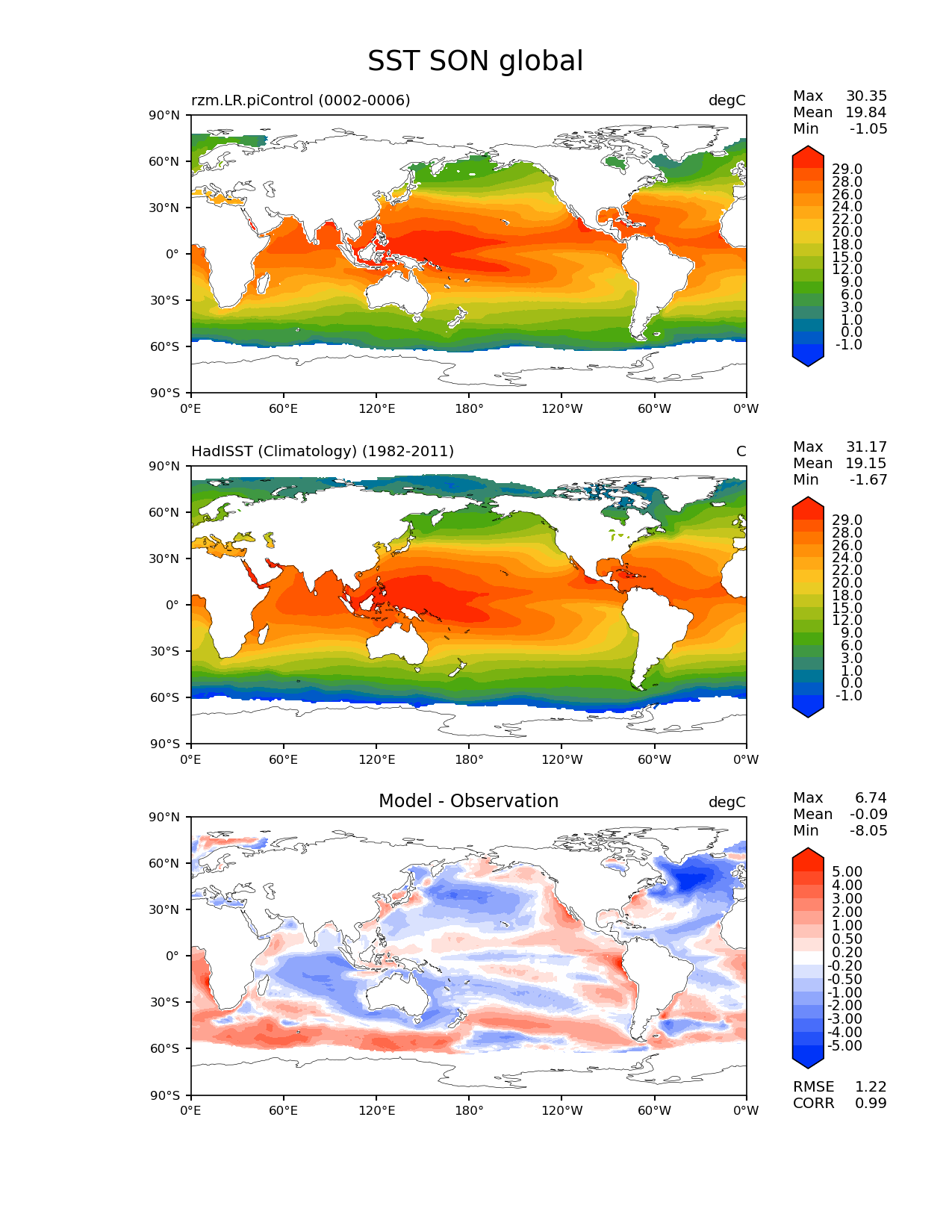 Use this command to recreate this image: | e3sm_diags lat_lon --no_viewer --case_id 'SST_CL_HadISST' --sets 'lat_lon' --run_type 'model_vs_obs' --variables 'SST' --seasons 'SON' --regions 'global' --regrid_tool 'esmf' --regrid_method 'conservative' --main_title 'SST SON global' --backend 'mpl' --output_format 'png' --canvas_size_w '1212' --canvas_size_h '1628' --figsize '8.5' '11.0' --dpi '150' --arrows --contour_levels '-1' '0' '1' '3' '6' '9' '12' '15' '18' '20' '22' '24' '26' '28' '29' --test_name 'rzm.LR.piControl' --test_title ' ' --test_colormap 'cet_rainbow.rgb' --ref_name 'HadISST_CL' --reference_name 'HadISST (Climatology)' --reference_colormap 'cet_rainbow.rgb' --diff_title 'Model - Observation' --diff_colormap 'diverging_bwr.rgb' --diff_levels '-5' '-4' '-3' '-2' '-1' '-0.5' '-0.2' '0.2' '0.5' '1' '2' '3' '4' '5' --num_workers '4' --granulate 'variables' 'seasons' 'plevs' 'regions' --selectors 'sets' 'seasons' --reference_data_path '/global/cfs/cdirs/e3sm/acme_diags/obs_for_e3sm_diags/climatology/' --test_data_path '/global/cscratch1/sd/xsongsio/E3SM_simulations/rzm.LR.piControl/diag/clim_rgr/5yr/' --results_dir '/global/cfs/cdirs/e3sm/www/xsongsio/rzm.LR.piControl/5yr' |