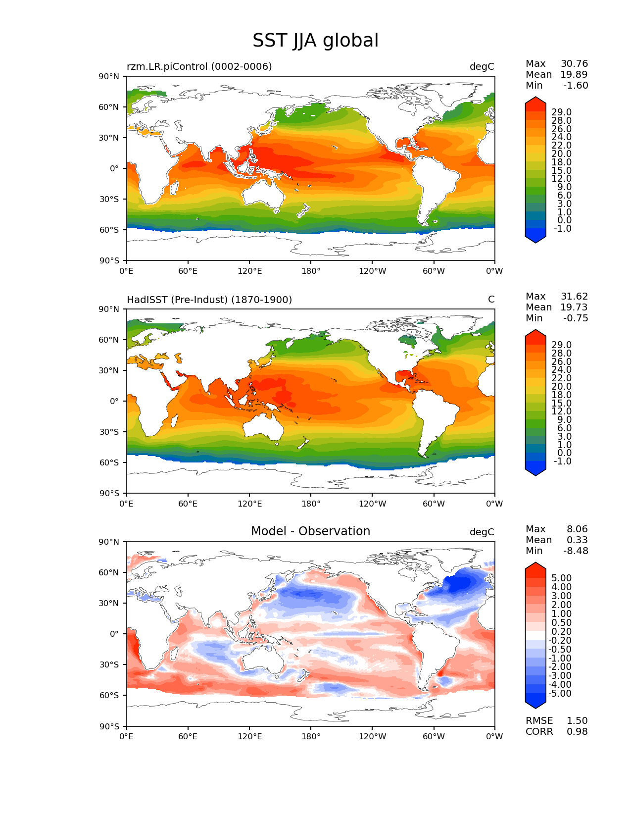 Use this command to recreate this image: | e3sm_diags lat_lon --no_viewer --case_id 'SST_PI_HadISST' --sets 'lat_lon' --run_type 'model_vs_obs' --variables 'SST' --seasons 'JJA' --regions 'global' --regrid_tool 'esmf' --regrid_method 'conservative' --main_title 'SST JJA global' --backend 'mpl' --output_format 'png' --canvas_size_w '1212' --canvas_size_h '1628' --figsize '8.5' '11.0' --dpi '150' --arrows --contour_levels '-1' '0' '1' '3' '6' '9' '12' '15' '18' '20' '22' '24' '26' '28' '29' --test_name 'rzm.LR.piControl' --test_title ' ' --test_colormap 'cet_rainbow.rgb' --ref_name 'HadISST_PI' --reference_name 'HadISST (Pre-Indust)' --reference_colormap 'cet_rainbow.rgb' --diff_title 'Model - Observation' --diff_colormap 'diverging_bwr.rgb' --diff_levels '-5' '-4' '-3' '-2' '-1' '-0.5' '-0.2' '0.2' '0.5' '1' '2' '3' '4' '5' --num_workers '4' --granulate 'variables' 'seasons' 'plevs' 'regions' --selectors 'sets' 'seasons' --reference_data_path '/global/cfs/cdirs/e3sm/acme_diags/obs_for_e3sm_diags/climatology/' --test_data_path '/global/cscratch1/sd/xsongsio/E3SM_simulations/rzm.LR.piControl/diag/clim_rgr/5yr/' --results_dir '/global/cfs/cdirs/e3sm/www/xsongsio/rzm.LR.piControl/5yr' |