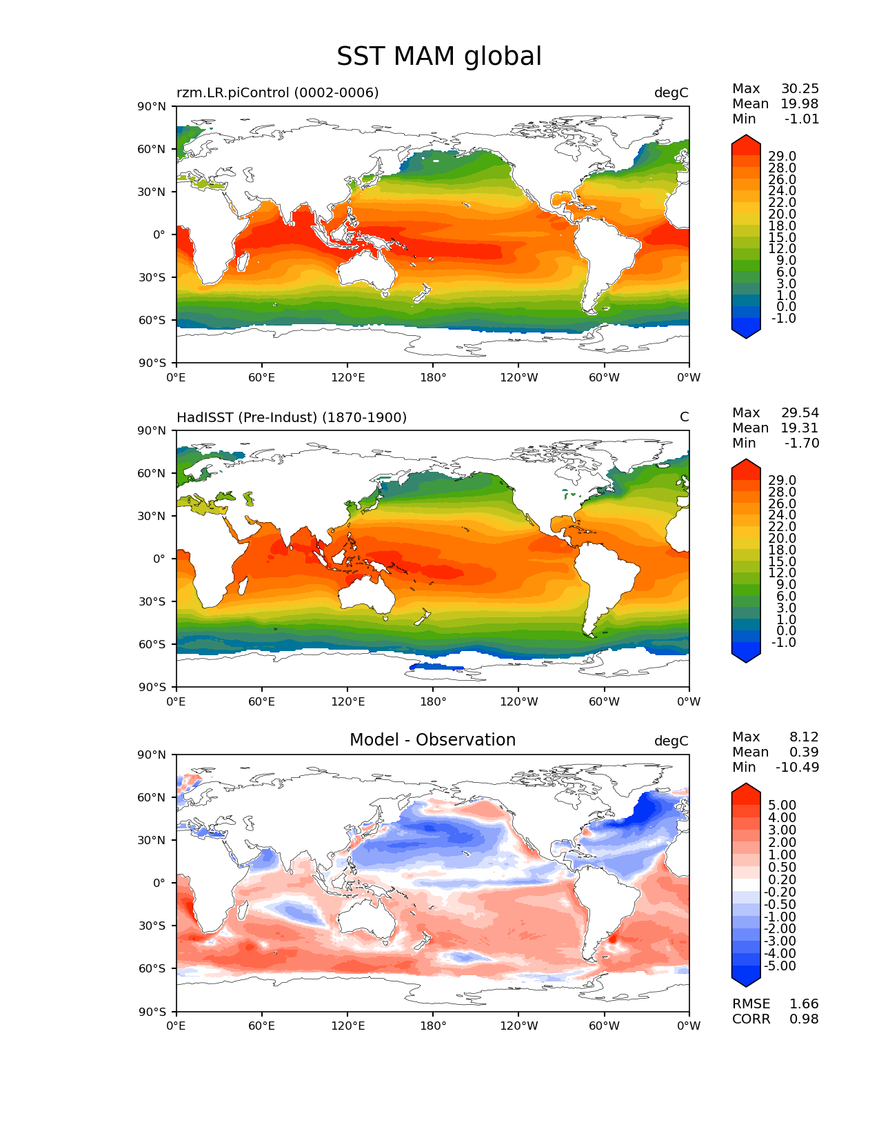 Use this command to recreate this image: | e3sm_diags lat_lon --no_viewer --case_id 'SST_PI_HadISST' --sets 'lat_lon' --run_type 'model_vs_obs' --variables 'SST' --seasons 'MAM' --regions 'global' --regrid_tool 'esmf' --regrid_method 'conservative' --main_title 'SST MAM global' --backend 'mpl' --output_format 'png' --canvas_size_w '1212' --canvas_size_h '1628' --figsize '8.5' '11.0' --dpi '150' --arrows --contour_levels '-1' '0' '1' '3' '6' '9' '12' '15' '18' '20' '22' '24' '26' '28' '29' --test_name 'rzm.LR.piControl' --test_title ' ' --test_colormap 'cet_rainbow.rgb' --ref_name 'HadISST_PI' --reference_name 'HadISST (Pre-Indust)' --reference_colormap 'cet_rainbow.rgb' --diff_title 'Model - Observation' --diff_colormap 'diverging_bwr.rgb' --diff_levels '-5' '-4' '-3' '-2' '-1' '-0.5' '-0.2' '0.2' '0.5' '1' '2' '3' '4' '5' --num_workers '4' --granulate 'variables' 'seasons' 'plevs' 'regions' --selectors 'sets' 'seasons' --reference_data_path '/global/cfs/cdirs/e3sm/acme_diags/obs_for_e3sm_diags/climatology/' --test_data_path '/global/cscratch1/sd/xsongsio/E3SM_simulations/rzm.LR.piControl/diag/clim_rgr/5yr/' --results_dir '/global/cfs/cdirs/e3sm/www/xsongsio/rzm.LR.piControl/5yr' |