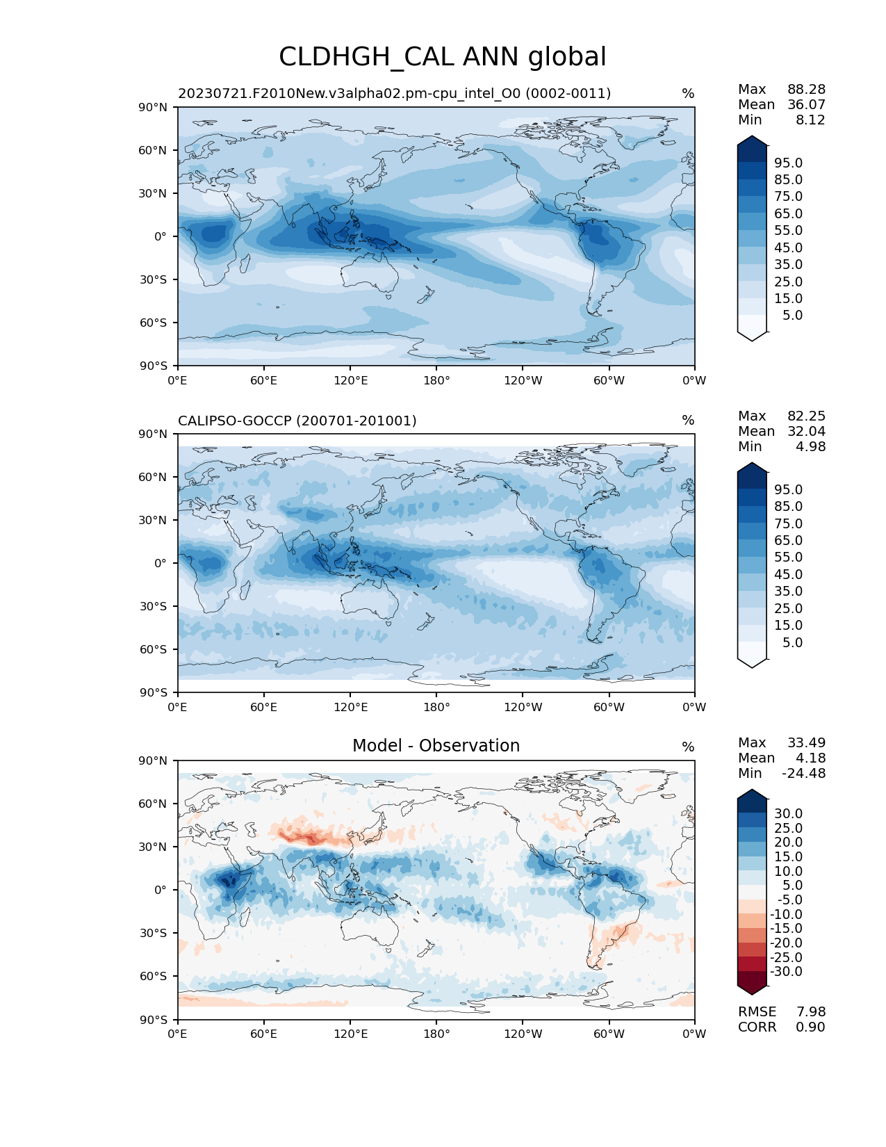 Use this command to recreate this image: | e3sm_diags lat_lon --no_viewer --case_id 'Cloud Calipso' --sets 'lat_lon' --run_type 'model_vs_obs' --variables 'CLDHGH_CAL' --seasons 'ANN' --regions 'global' --regrid_tool 'esmf' --regrid_method 'conservative' --main_title 'CLDHGH_CAL ANN global' --backend 'mpl' --output_format 'png' --canvas_size_w '1212' --canvas_size_h '1628' --figsize '8.5' '11.0' --dpi '150' --arrows --contour_levels '5' '15' '25' '35' '45' '55' '65' '75' '85' '95' --test_name '20230721.F2010New.v3alpha02.pm-cpu_intel_O0' --test_title ' ' --test_colormap 'Blues' --ref_name 'CALIPSOCOSP' --reference_name 'CALIPSO-GOCCP' --reference_colormap 'Blues' --diff_title 'Model - Observation' --diff_colormap 'RdBu' --diff_levels '-30' '-25' '-20' '-15' '-10' '-5' '5' '10' '15' '20' '25' '30' --multiprocessing --num_workers '32' --granulate 'variables' 'seasons' 'plevs' 'regions' --selectors 'sets' 'seasons' --reference_data_path '/global/cfs/cdirs/e3sm/acme_diags/obs_for_e3sm_diags/climatology/' --test_data_path '/pscratch/sd/x/xsongsio/E3SM_simulation/20230721.F2010New.v3alpha02.pm-cpu_intel_O0/diag/clim_rgr/' --results_dir '/global/cfs/cdirs/e3sm/www/xsongsio/v3alpha02.pm-cpu_intel_O0/2-11' |