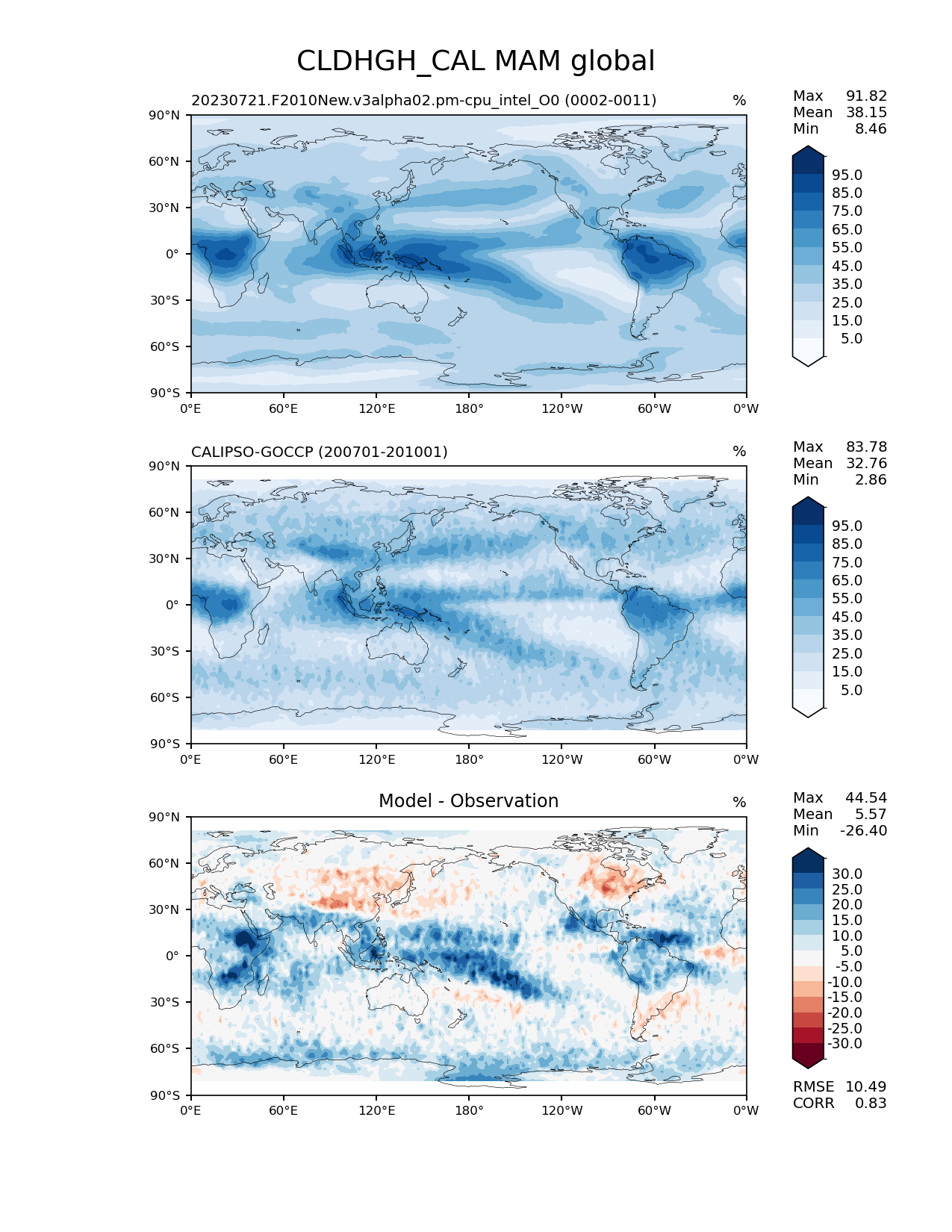Use this command to recreate this image: | e3sm_diags lat_lon --no_viewer --case_id 'Cloud Calipso' --sets 'lat_lon' --run_type 'model_vs_obs' --variables 'CLDHGH_CAL' --seasons 'MAM' --regions 'global' --regrid_tool 'esmf' --regrid_method 'conservative' --main_title 'CLDHGH_CAL MAM global' --backend 'mpl' --output_format 'png' --canvas_size_w '1212' --canvas_size_h '1628' --figsize '8.5' '11.0' --dpi '150' --arrows --contour_levels '5' '15' '25' '35' '45' '55' '65' '75' '85' '95' --test_name '20230721.F2010New.v3alpha02.pm-cpu_intel_O0' --test_title ' ' --test_colormap 'Blues' --ref_name 'CALIPSOCOSP' --reference_name 'CALIPSO-GOCCP' --reference_colormap 'Blues' --diff_title 'Model - Observation' --diff_colormap 'RdBu' --diff_levels '-30' '-25' '-20' '-15' '-10' '-5' '5' '10' '15' '20' '25' '30' --multiprocessing --num_workers '32' --granulate 'variables' 'seasons' 'plevs' 'regions' --selectors 'sets' 'seasons' --reference_data_path '/global/cfs/cdirs/e3sm/acme_diags/obs_for_e3sm_diags/climatology/' --test_data_path '/pscratch/sd/x/xsongsio/E3SM_simulation/20230721.F2010New.v3alpha02.pm-cpu_intel_O0/diag/clim_rgr/' --results_dir '/global/cfs/cdirs/e3sm/www/xsongsio/v3alpha02.pm-cpu_intel_O0/2-11' |