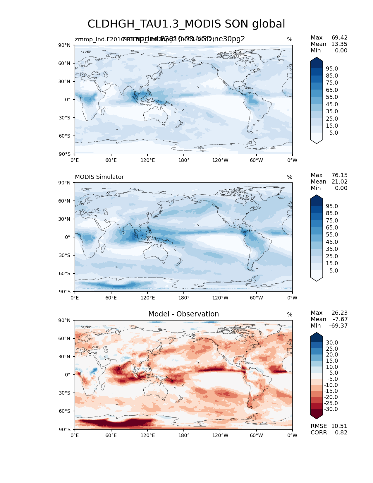 Use this command to recreate this image: | e3sm_diags lat_lon --no_viewer --case_id 'Cloud MODIS' --sets 'lat_lon' --run_type 'model_vs_obs' --variables 'CLDHGH_TAU1.3_MODIS' --seasons 'SON' --regions 'global' --regrid_tool 'esmf' --regrid_method 'conservative' --main_title 'CLDHGH_TAU1.3_MODIS SON global' --backend 'mpl' --output_format 'png' --canvas_size_w '1212' --canvas_size_h '1628' --figsize '8.5' '11.0' --dpi '150' --arrows --contour_levels '5' '15' '25' '35' '45' '55' '65' '75' '85' '95' --test_name 'zmmp_lnd.F2010-P3.NGD.ne30pg2' --test_title 'zmmp_lnd.F2010-P3.NGD.ne30pg2' --test_colormap 'Blues' --ref_name 'MODISCOSP' --reference_name 'MODIS Simulator' --reference_colormap 'Blues' --diff_title 'Model - Observation' --diff_colormap 'RdBu' --diff_levels '-30' '-25' '-20' '-15' '-10' '-5' '5' '10' '15' '20' '25' '30' --num_workers '4' --granulate 'variables' 'seasons' 'plevs' 'regions' --selectors 'sets' 'seasons' --reference_data_path '/global/cfs/cdirs/e3sm/acme_diags/obs_for_e3sm_diags/climatology/' --test_data_path '/global/cscratch1/sd/xsongsio/E3SM_simulations/zmmp_lnd.F2010-P3.NGD.ne30pg2/diag/clim_rgr/2yr/' --results_dir '/global/cfs/cdirs/e3sm/www/xsongsio/zmmp_lnd.F2010-P3.NGD.ne30pg2/2yr' |