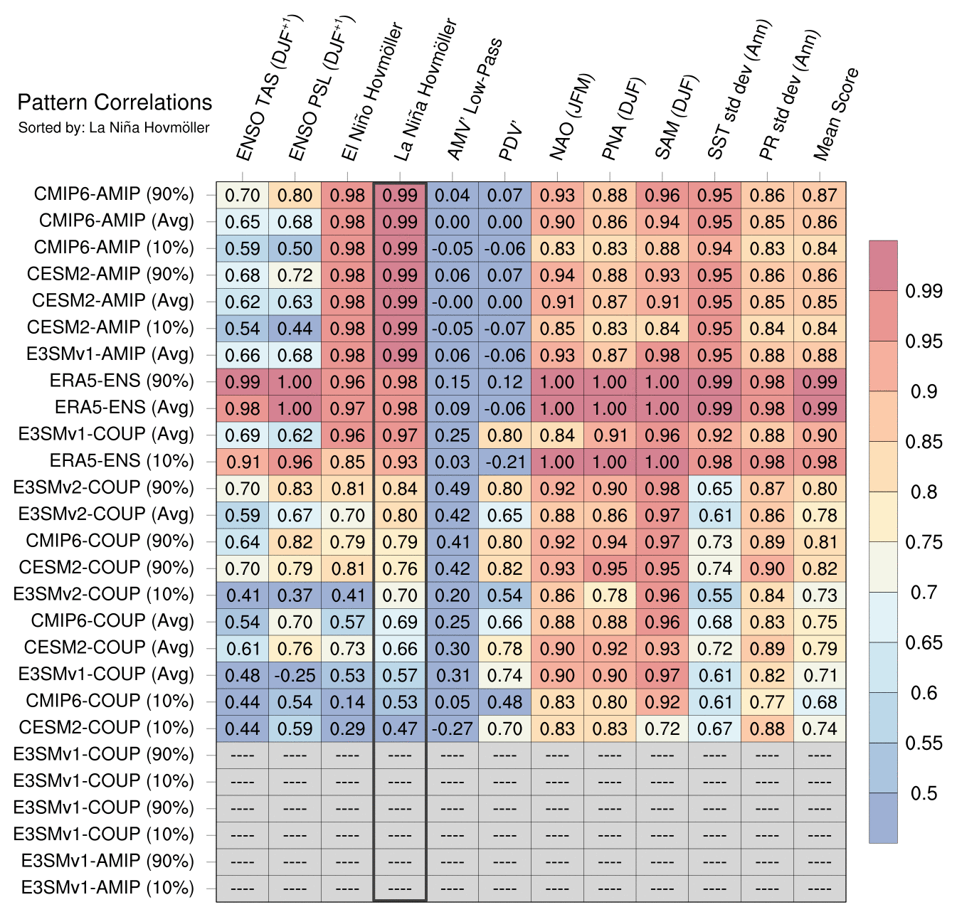 Sort By: | Namelist (default) | Namelist (Alphabetically) | ENSO TAS | ENSO PSL | El Niño Hovmöller La Niña Hovmöller | AMV' Low-Pass | PDV' | NAO | PNA | SAM | SST std dev | PR std dev | Mean Score |