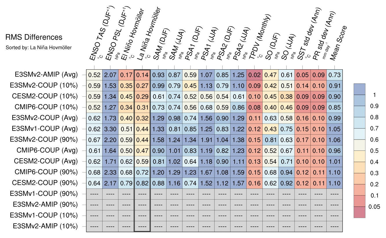 Sort By: | Namelist (default) | Namelist (Alphabetically) | ENSO TAS | ENSO PSL | El Niño Hovmöller La Niña Hovmöller | SAM (NDJFMA) | SAM (MJJASO) | PSA1 (NDJFMA) | PSA1 (MJJASO) | PSA2 (NDJFMA) | PSA2 (MJJASO) | TPDV (Monthly) | SO (NDJFMA) | SO (MJJASO) | SST std dev | PR std dev | Mean Score |