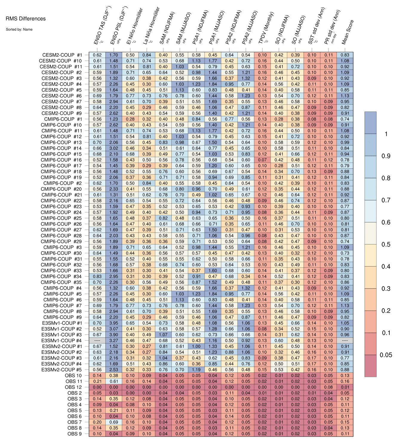 Sort By: | Namelist (default) | Namelist (Alphabetically) | ENSO TAS | ENSO PSL | El Niño Hovmöller La Niña Hovmöller | SAM (NDJFMA) | SAM (MJJASO) | PSA1 (NDJFMA) | PSA1 (MJJASO) | PSA2 (NDJFMA) | PSA2 (MJJASO) | TPDV (Monthly) | SO (NDJFMA) | SO (MJJASO) | SST std dev | PR std dev | Mean Score |