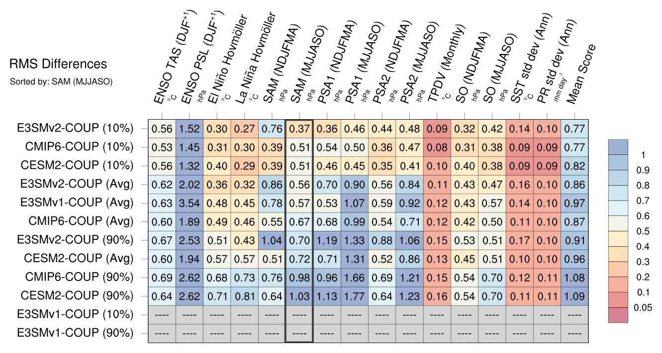 Sort By: | Namelist (default) | Namelist (Alphabetically) | ENSO TAS | ENSO PSL | El Niño Hovmöller La Niña Hovmöller | SAM (NDJFMA) | SAM (warm) | PSA1 (NDJFMA) | PSA1 (MJJASO) | PSA2 (NDJFMA) | PSA2 (MJJASO) | TPDV (Monthly) | SO (NDJFMA) | SO (MJJASO) | SST std dev | PR std dev | Mean Score |