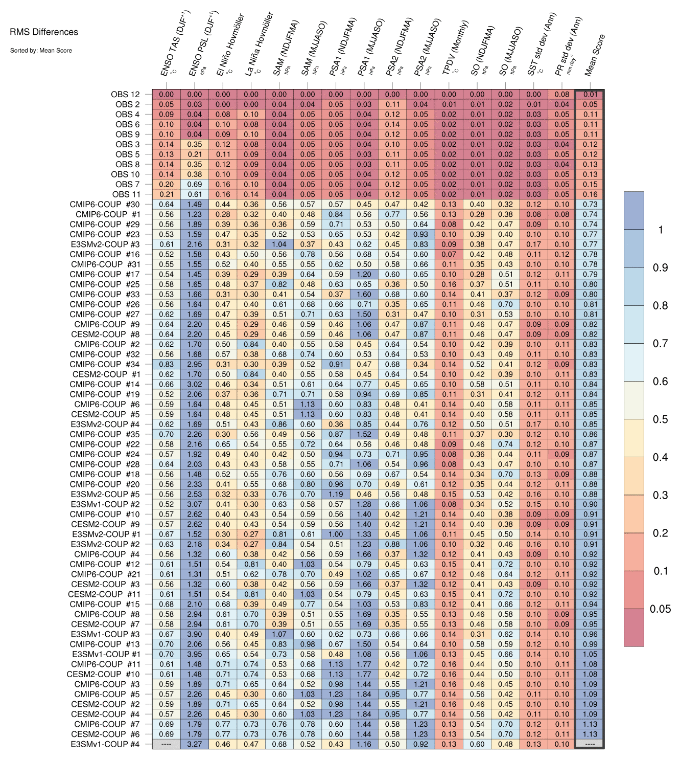 Sort By: | Namelist (default) | Namelist (Alphabetically) | ENSO TAS | ENSO PSL | El Niño Hovmöller La Niña Hovmöller | SAM (NDJFMA) | SAM (MJJASO) | PSA1 (NDJFMA) | PSA1 (MJJASO) | PSA2 (NDJFMA) | PSA2 (MJJASO) | TPDV (Monthly) | SO (NDJFMA) | SO (MJJASO) | SST std dev | PR std dev | Mean Score |