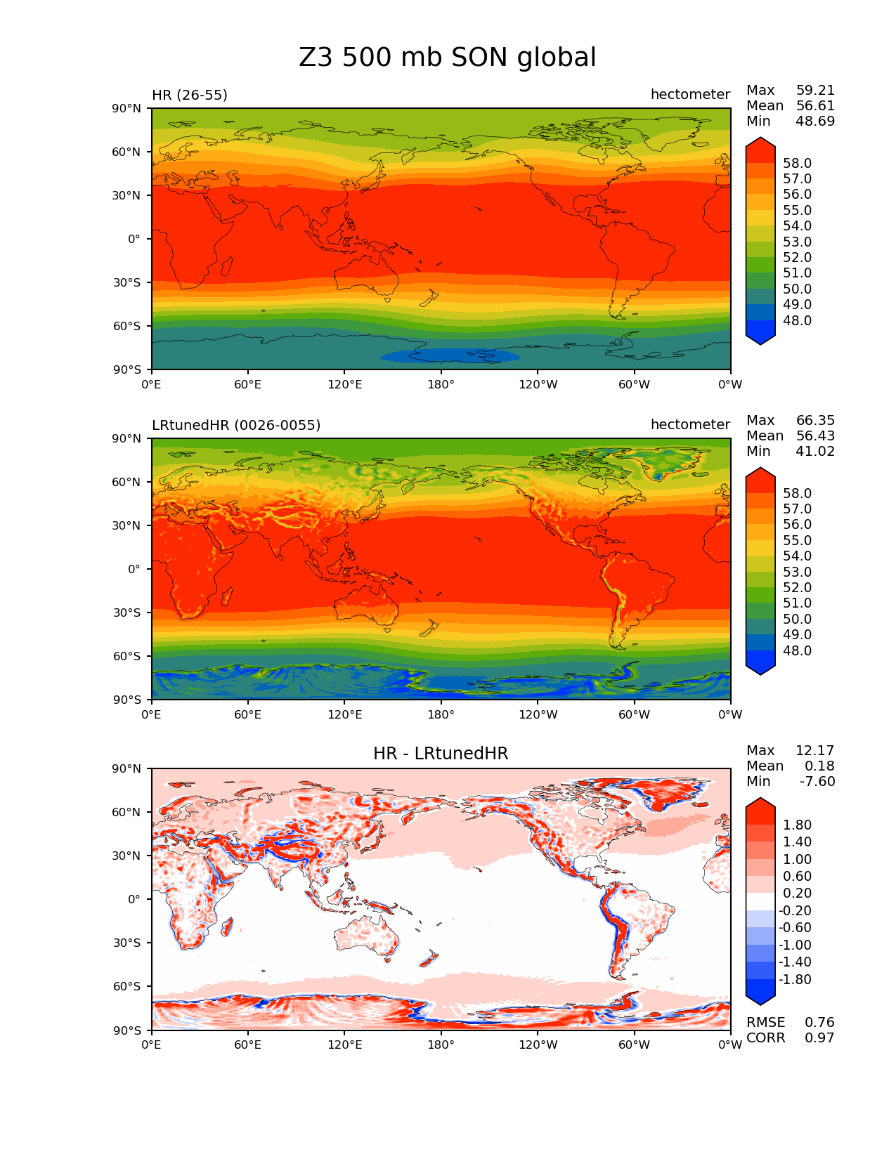 Use this command to recreate this image: | e3sm_diags --no_viewer --sets 'lat_lon' --case_id 'model_vs_model' --variables 'Z3' --seasons 'SON' --plevs '500.0' --contour_levels '48' '49' '50' '51' '52' '53' '54' '55' '56' '57' '58' --diff_levels '-1.8' '-1.4' '-1.0' '-0.6' '-0.2' '0.2' '0.6' '1.0' '1.4' '1.8' --run_type 'model_vs_model' --regions 'global' --regrid_tool 'esmf' --regrid_method 'conservative' --main_title 'Z3 500 mb SON global' --backend 'mpl' --save_netcdf --output_format 'png' --output_format_subplot 'pdf' --canvas_size_w '1212' --canvas_size_h '1628' --figsize '8.5' '11.0' --dpi '150' --arrows --test_name 'theta.20180906.branch_noCNT.A_WCYCL1950S_CMIP6_HR.ne120_oRRS18v3_ICG' --short_test_name 'HR' --test_colormap 'cet_rainbow.rgb' --ref_name '20190509.A_WCYCL1950S_CMIP6_LRtunedHR.ne30_oECv3_ICG.anvil' --reference_colormap 'cet_rainbow.rgb' --diff_title 'HR - LRtunedHR' --diff_colormap 'diverging_bwr.rgb' --num_workers '4' --granulate 'variables' 'seasons' 'regions' 'plevs' --selectors 'sets' 'seasons' --reference_data_path '/global/cscratch1/sd/tang30/E3SM_simulations/20190509.A_WCYCL1950S_CMIP6_LRtunedHR.ne30_oECv3_ICG.anvil/pp/clim_rgr/0026-0055/' --results_dir '/global/project/projectdirs/acme/www/zhang40/figs/' --test_data_path '/global/cscratch1/sd/acmedata/E3SM_simulations/theta.20180906.branch_noCNT.A_WCYCL1950S_CMIP6_HR.ne120_oRRS18v3_ICG/atm/mon_180x360' |